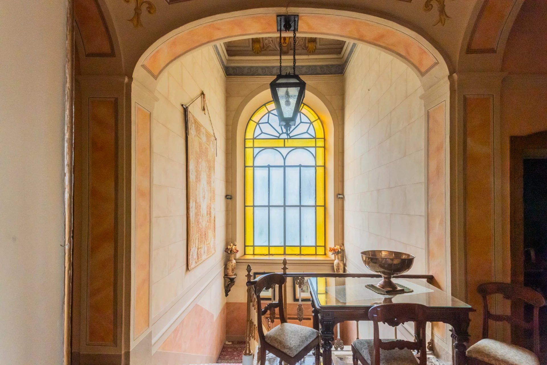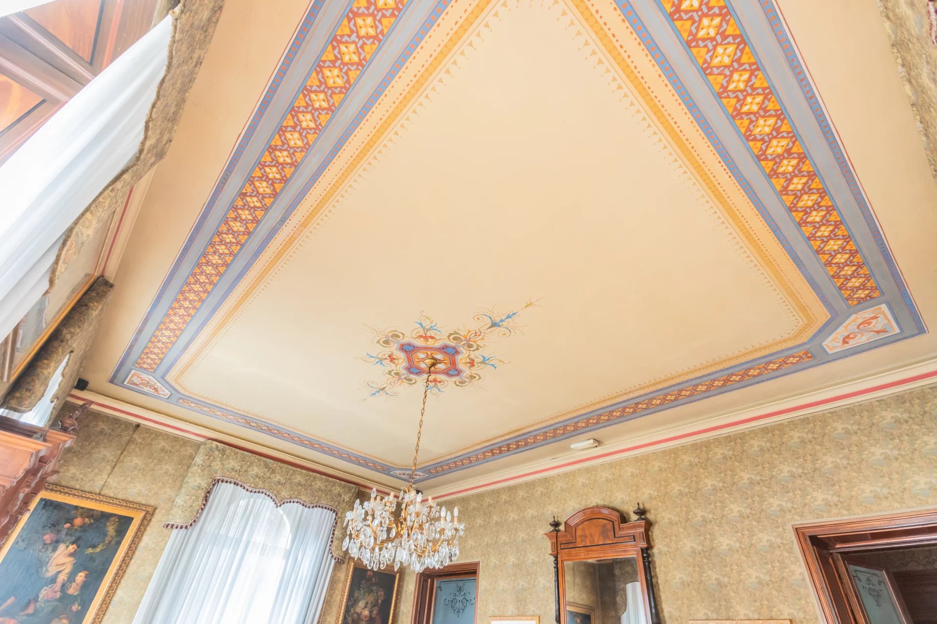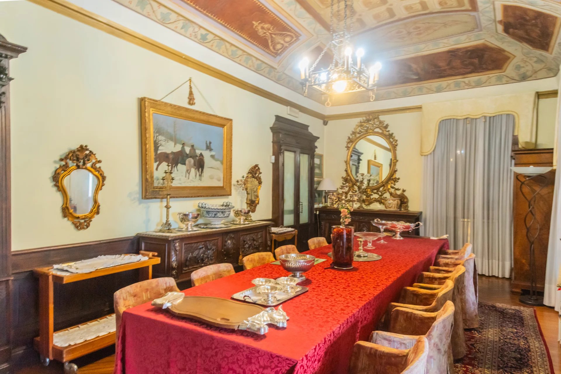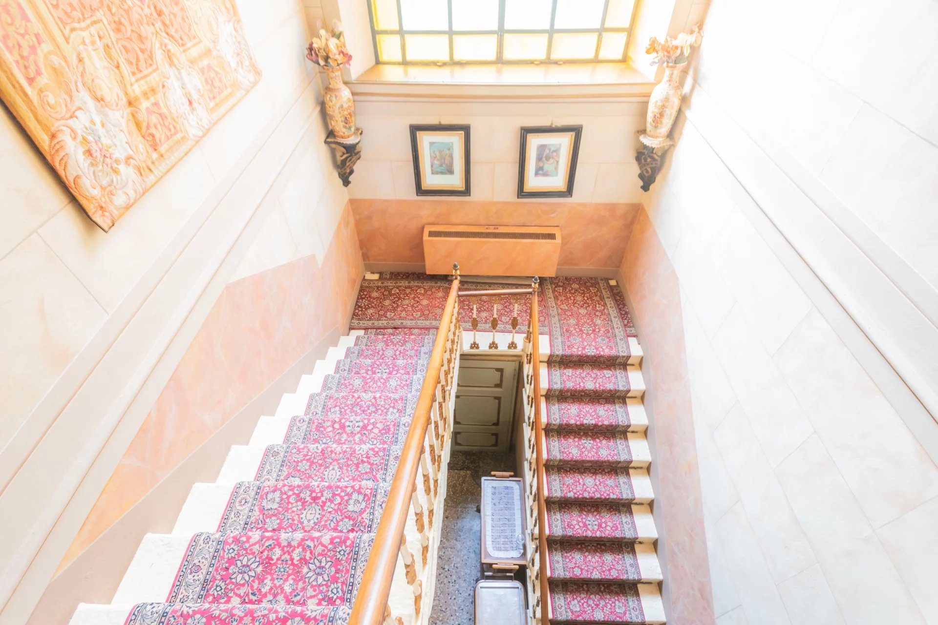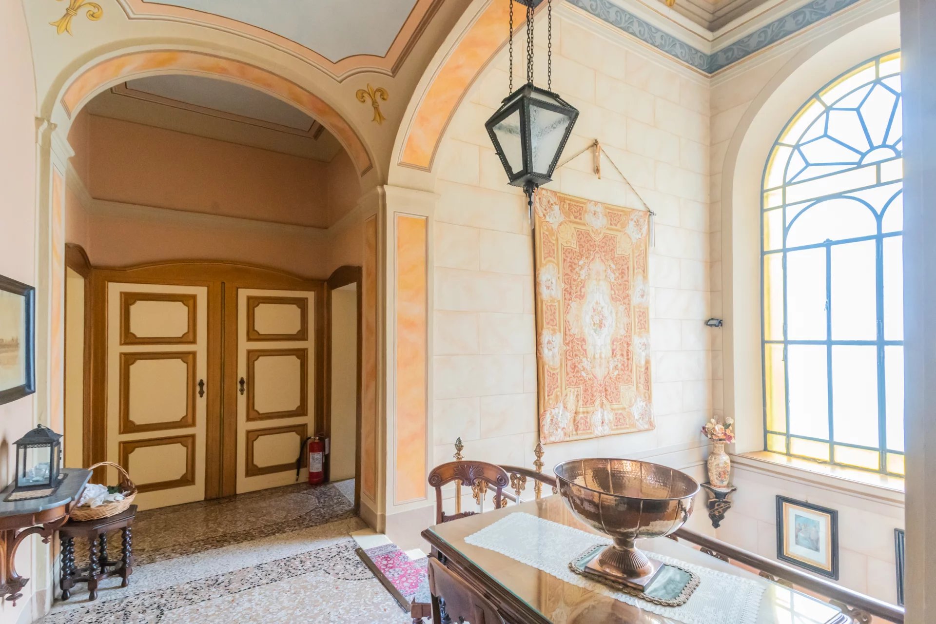 The castle features 27 rooms, including grand halls adorned with frescoes and Venetian terrazzo floors, and a bright salon with a veranda overlooking the garden.