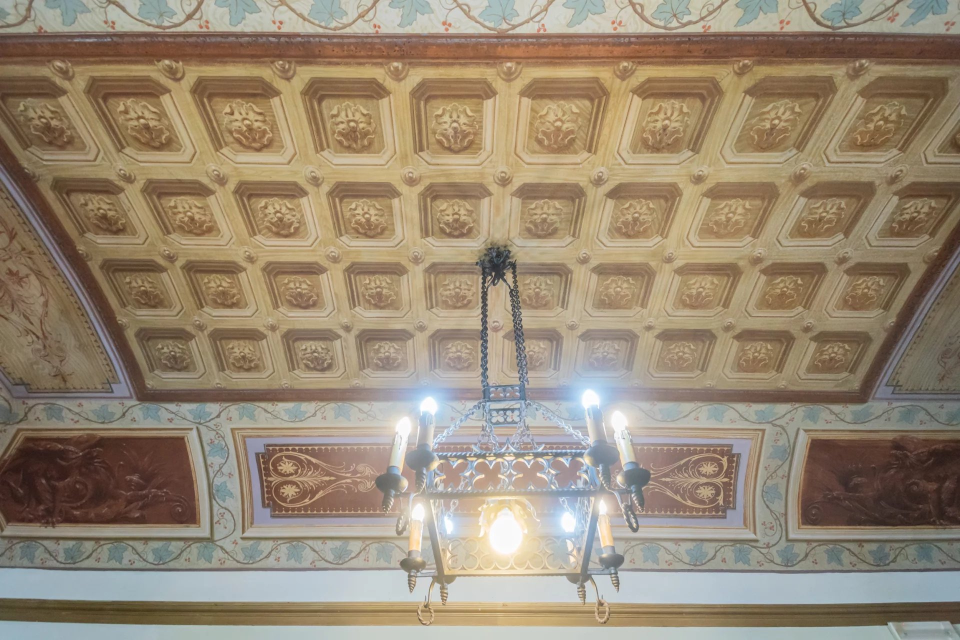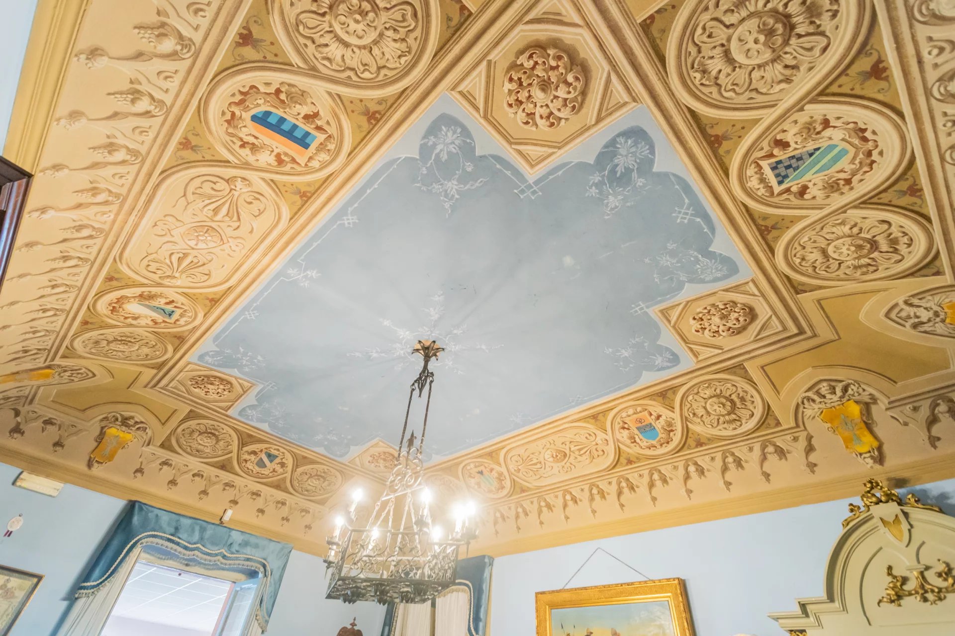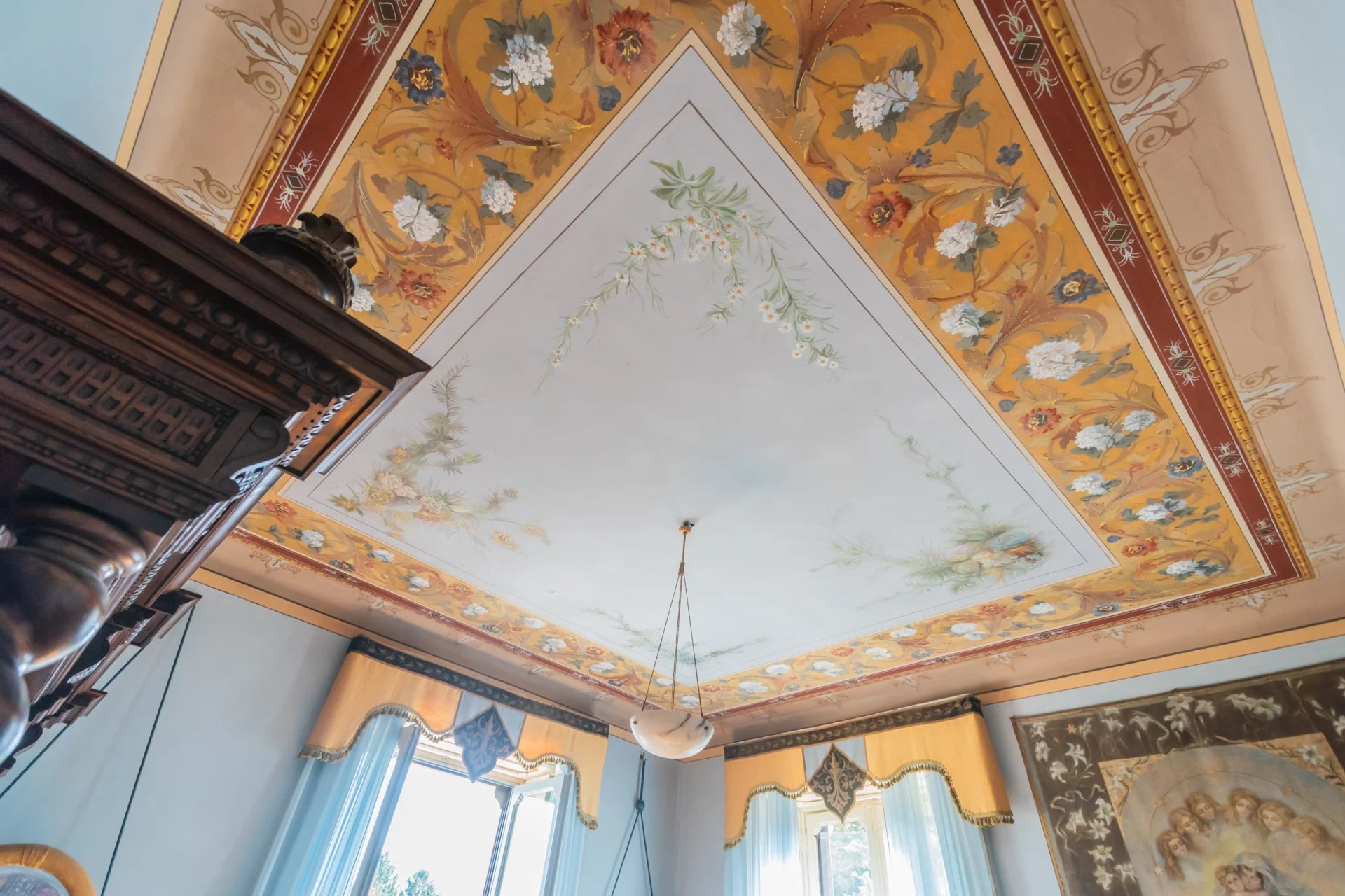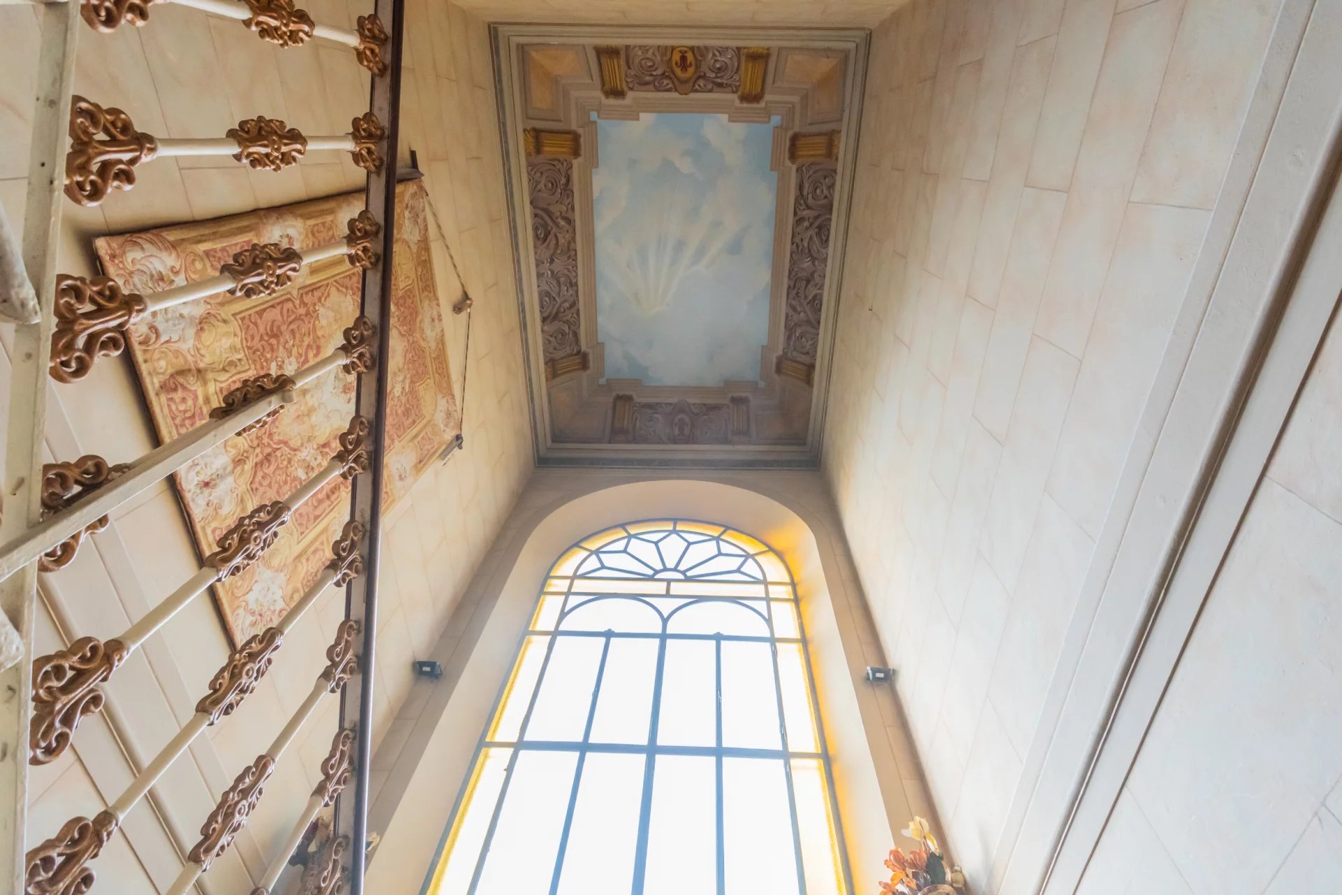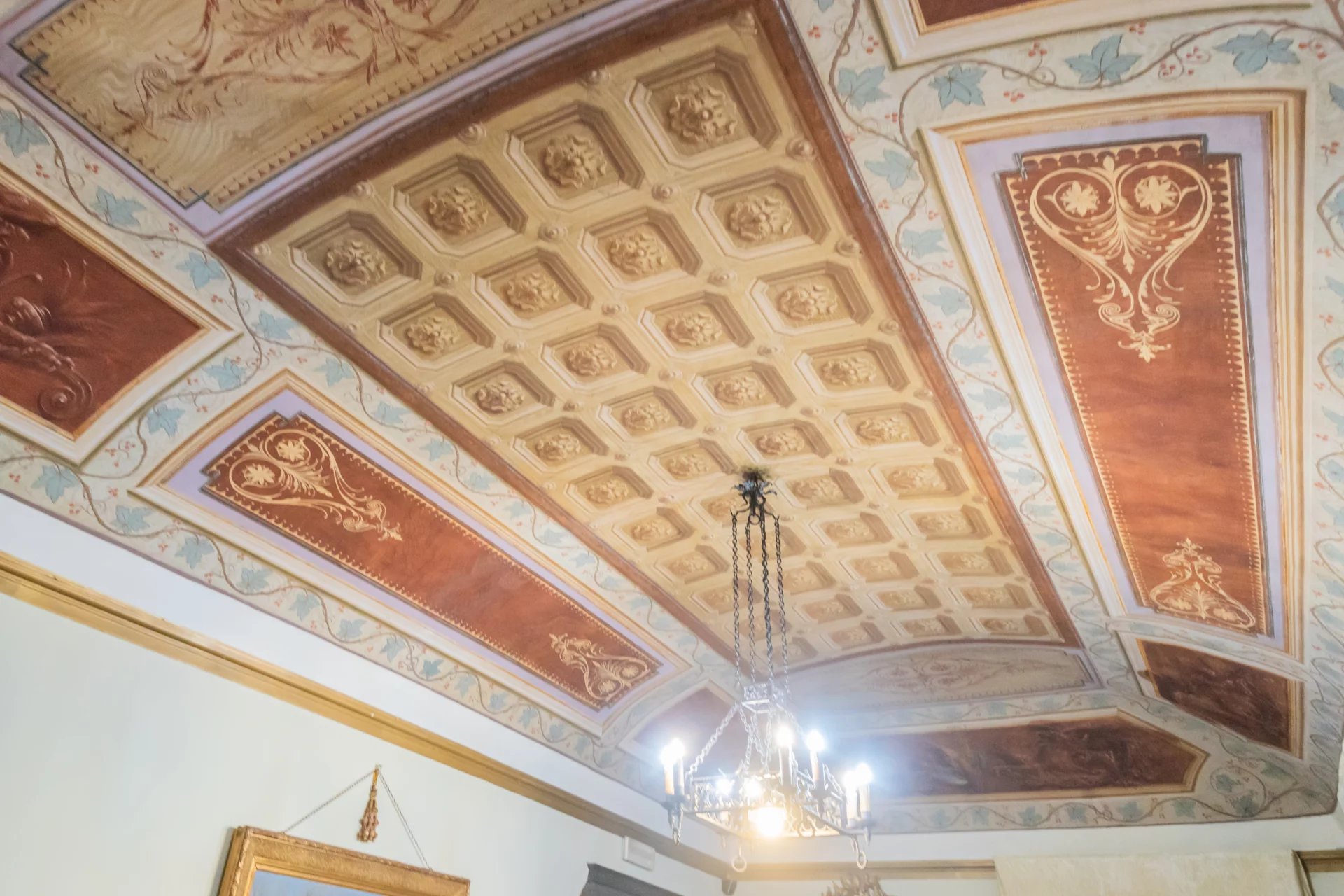 The castle features 27 rooms, including grand halls adorned with frescoes and Venetian terrazzo floors, and a bright salon with a veranda overlooking the garden.