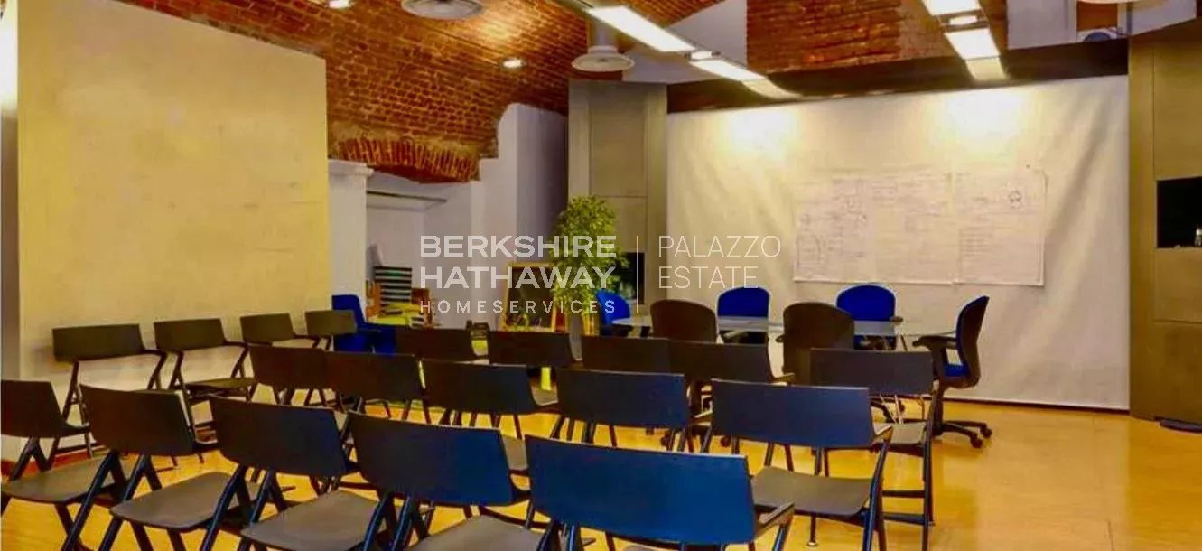 On the ground floor, there is the main entrance, a spacious double-height reception area of over 100 sqm, a large hall, four offices, one restroom, corridors and passageways, and a staircase connecting to both the mezzanine and basement levels.
