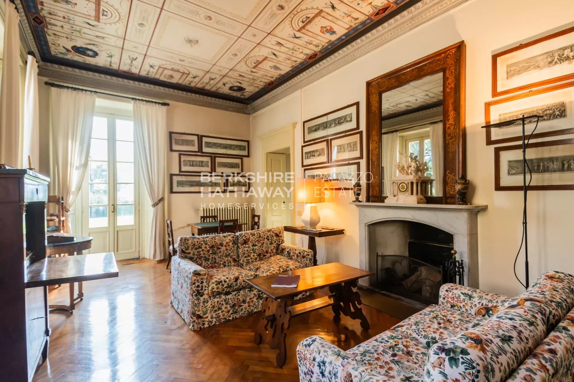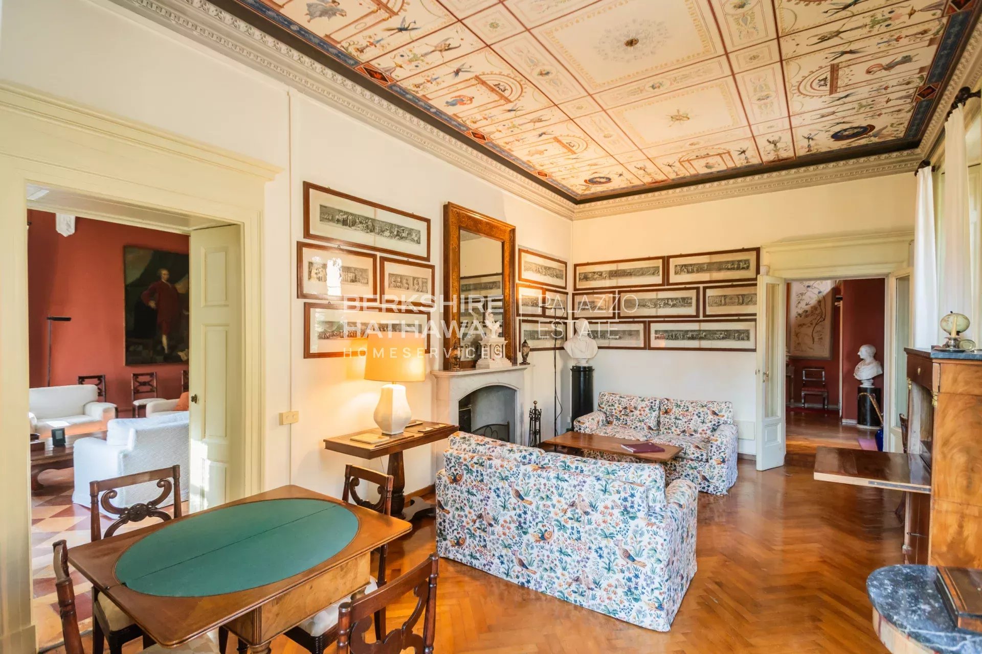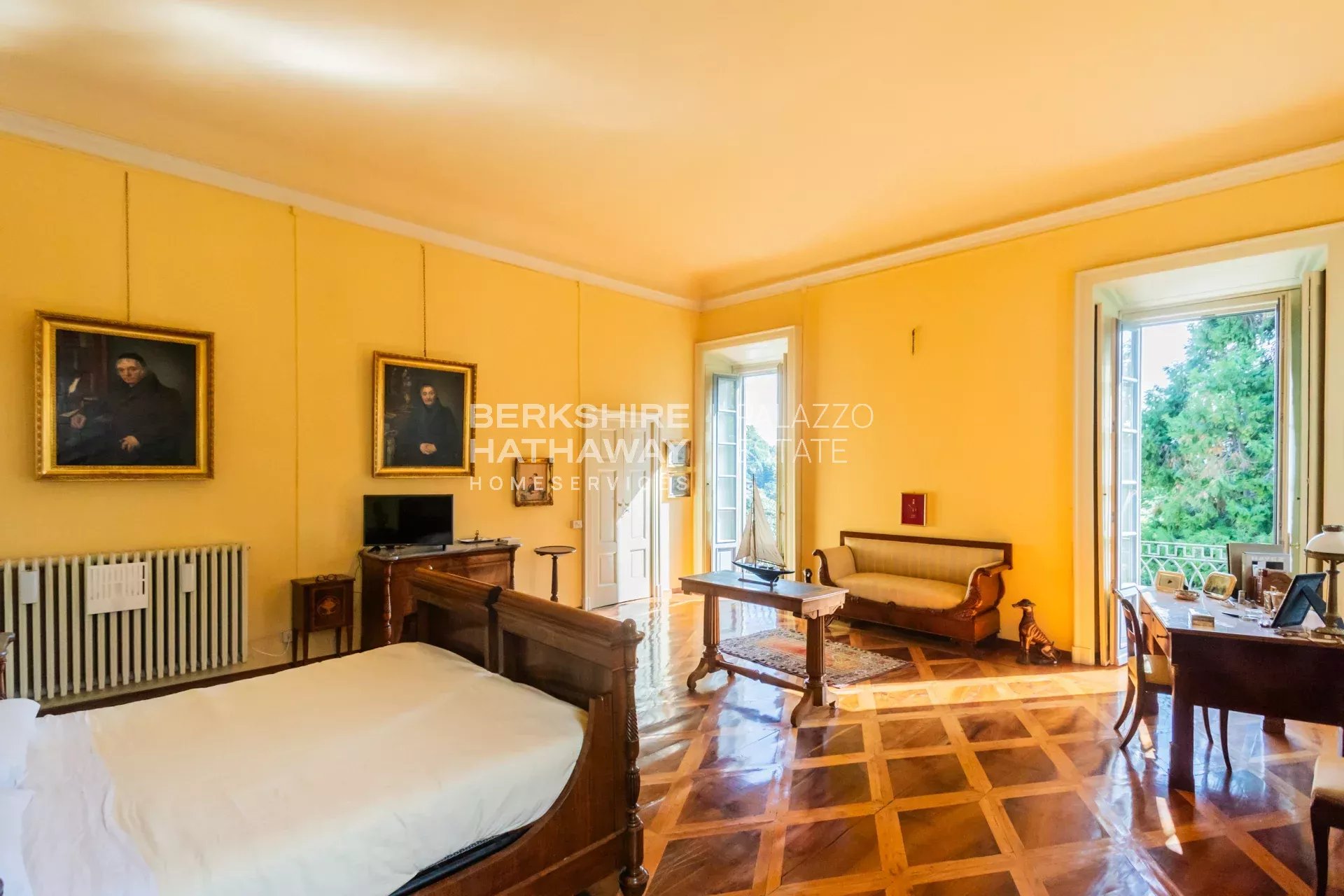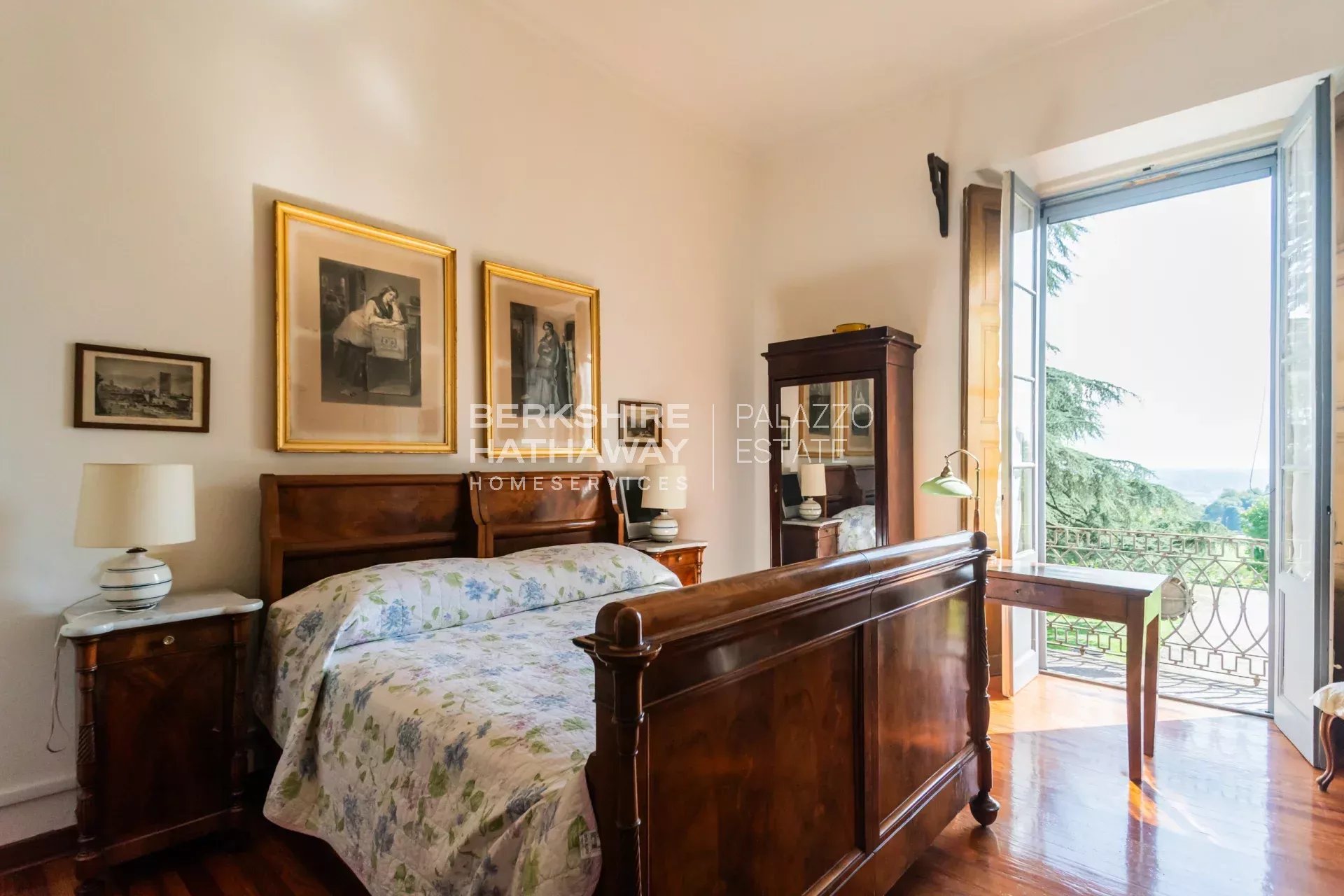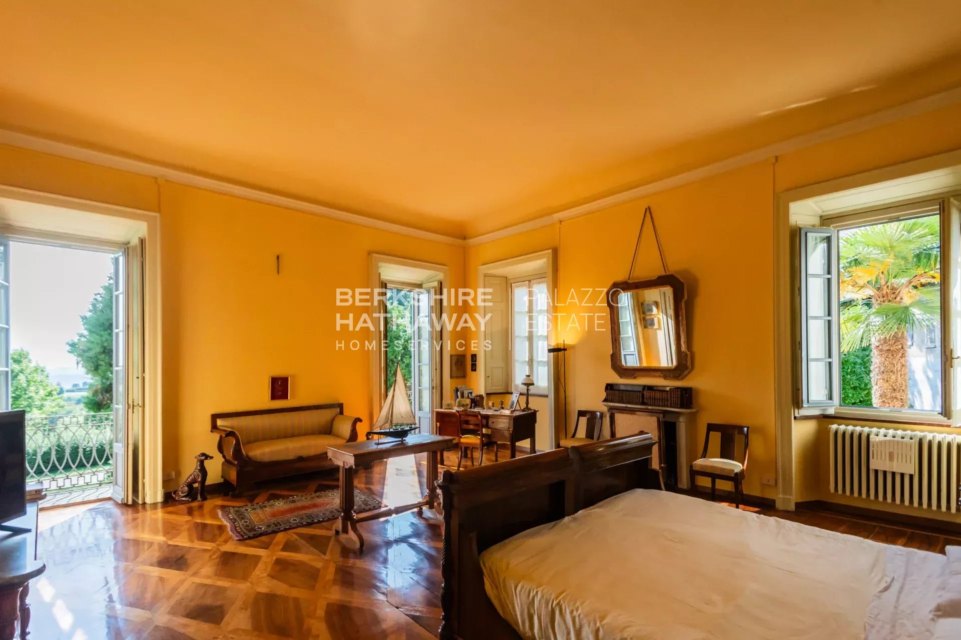 La villa principale si sviluppa su due livelli. L’atrio d’ingresso conduce alla zona living, articolata in tre ampi spazi di rappresentanza con soffitti affrescati e camini storici. Completano il piano giardino due sale da pranzo, due cucine di generose dimensioni, un bagno e numerosi locali di servizio. Il portico consente di organizzare cene all’aperto con una vista privilegiata sul parco. Uno scalone conduce alla zona notte, dove si trova l’appartamento padronale con ampia camera, cabina armadio, sala relax, zona fitness e bagno. Sulla medesima area si trovano otto camere con bagno en-suite, la sala biblioteca e una seconda cucina con sala da pranzo. Il piano è arricchito da sette balconi che si affacciano sul parco e sul panorama fino a Milano.