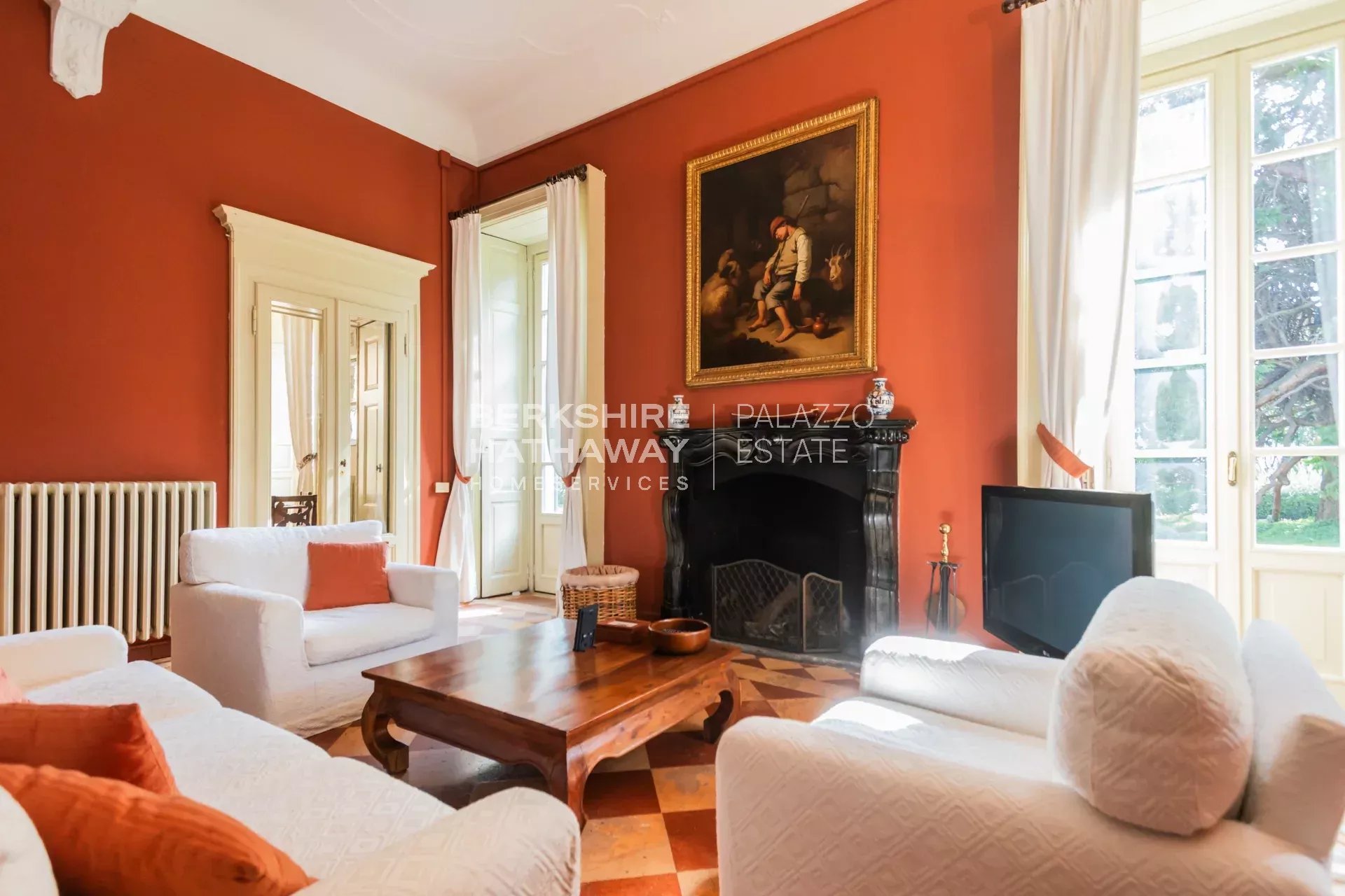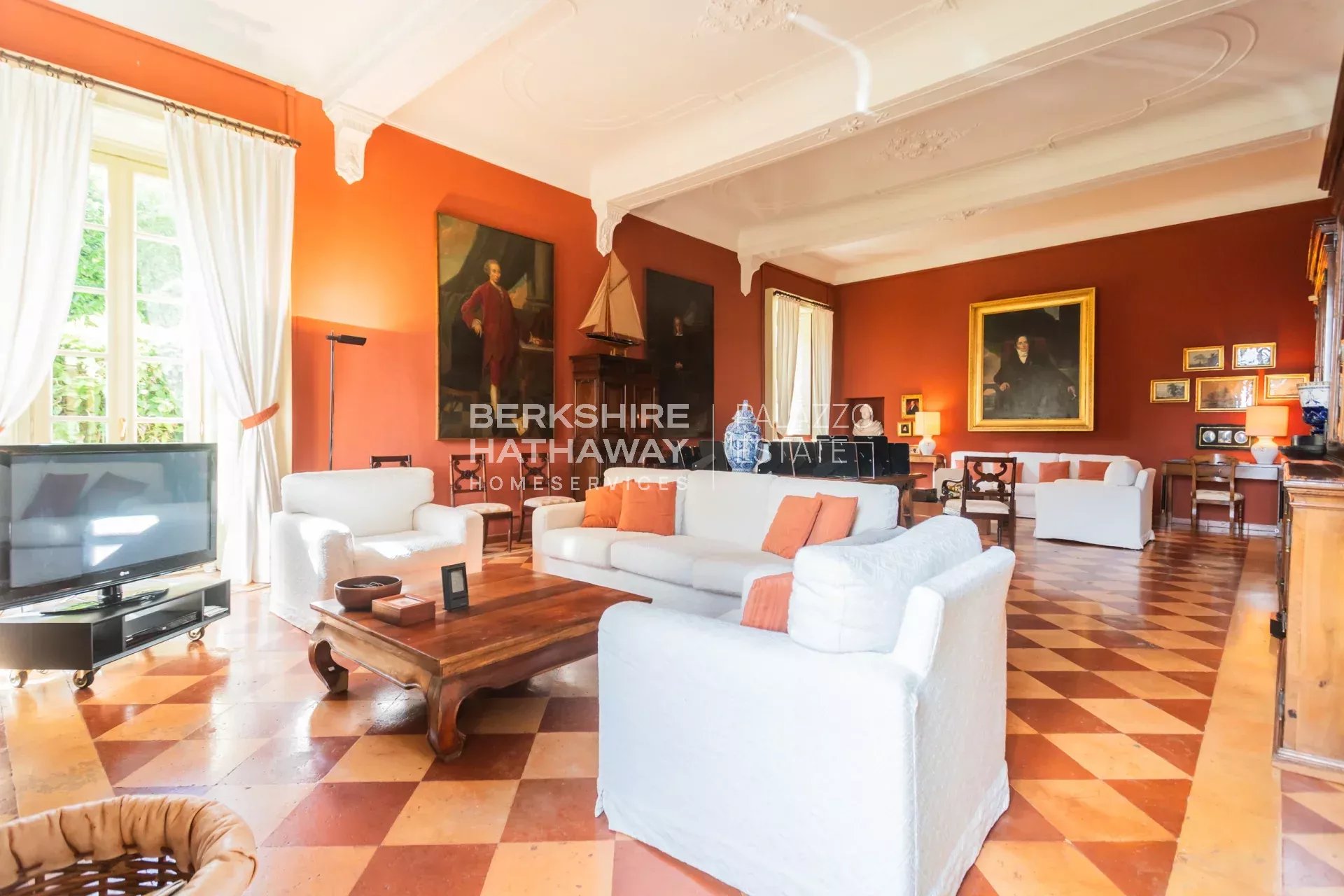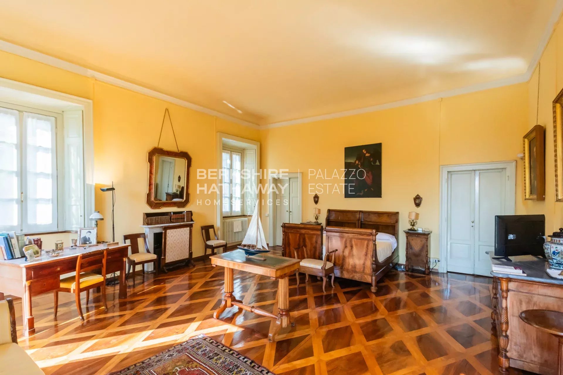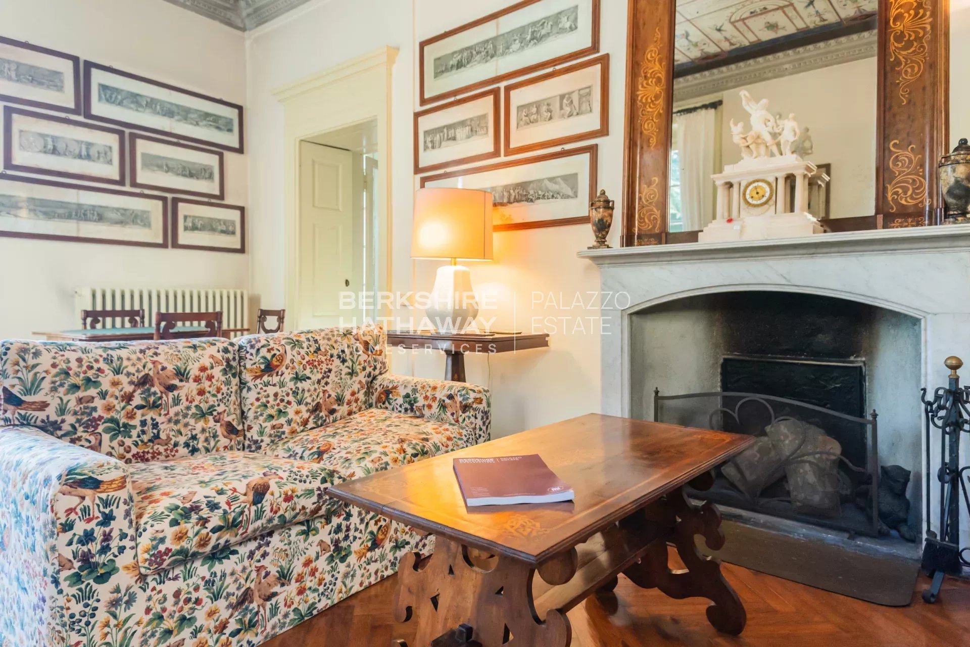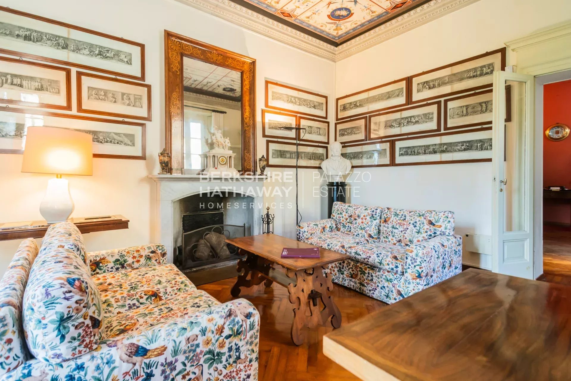 La villa principale si sviluppa su due livelli. L’atrio d’ingresso conduce alla zona living, articolata in tre ampi spazi di rappresentanza con soffitti affrescati e camini storici. Completano il piano giardino due sale da pranzo, due cucine di generose dimensioni, un bagno e numerosi locali di servizio. Il portico consente di organizzare cene all’aperto con una vista privilegiata sul parco. Uno scalone conduce alla zona notte, dove si trova l’appartamento padronale con ampia camera, cabina armadio, sala relax, zona fitness e bagno. Sulla medesima area si trovano otto camere con bagno en-suite, la sala biblioteca e una seconda cucina con sala da pranzo. Il piano è arricchito da sette balconi che si affacciano sul parco e sul panorama fino a Milano.