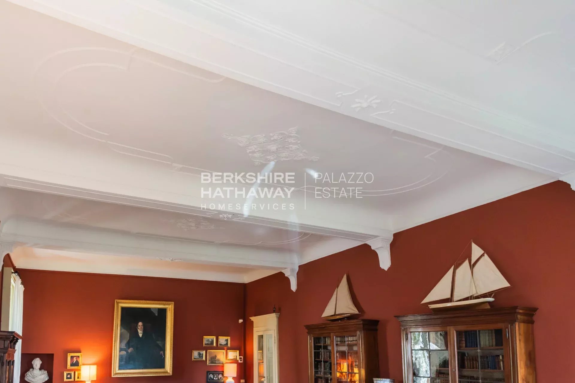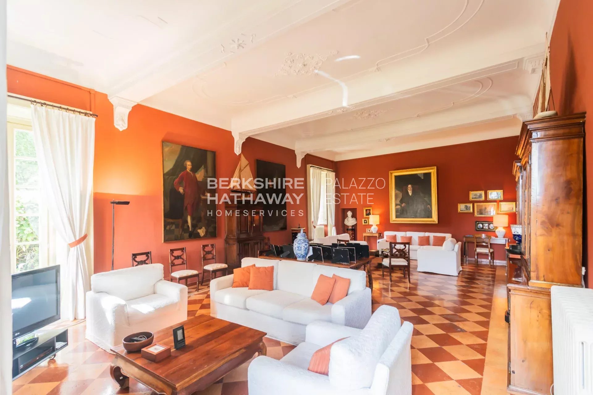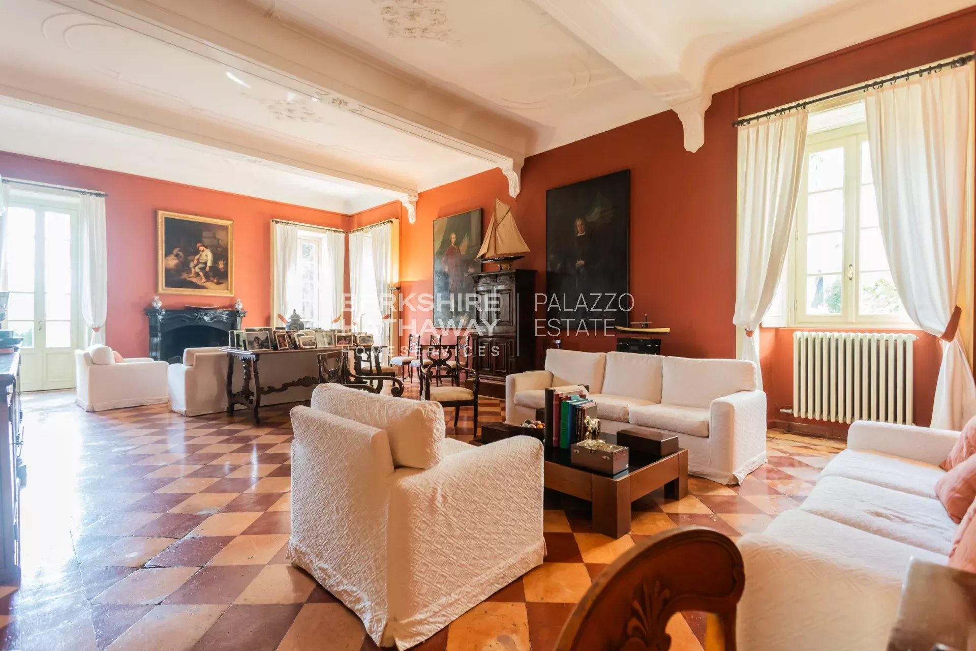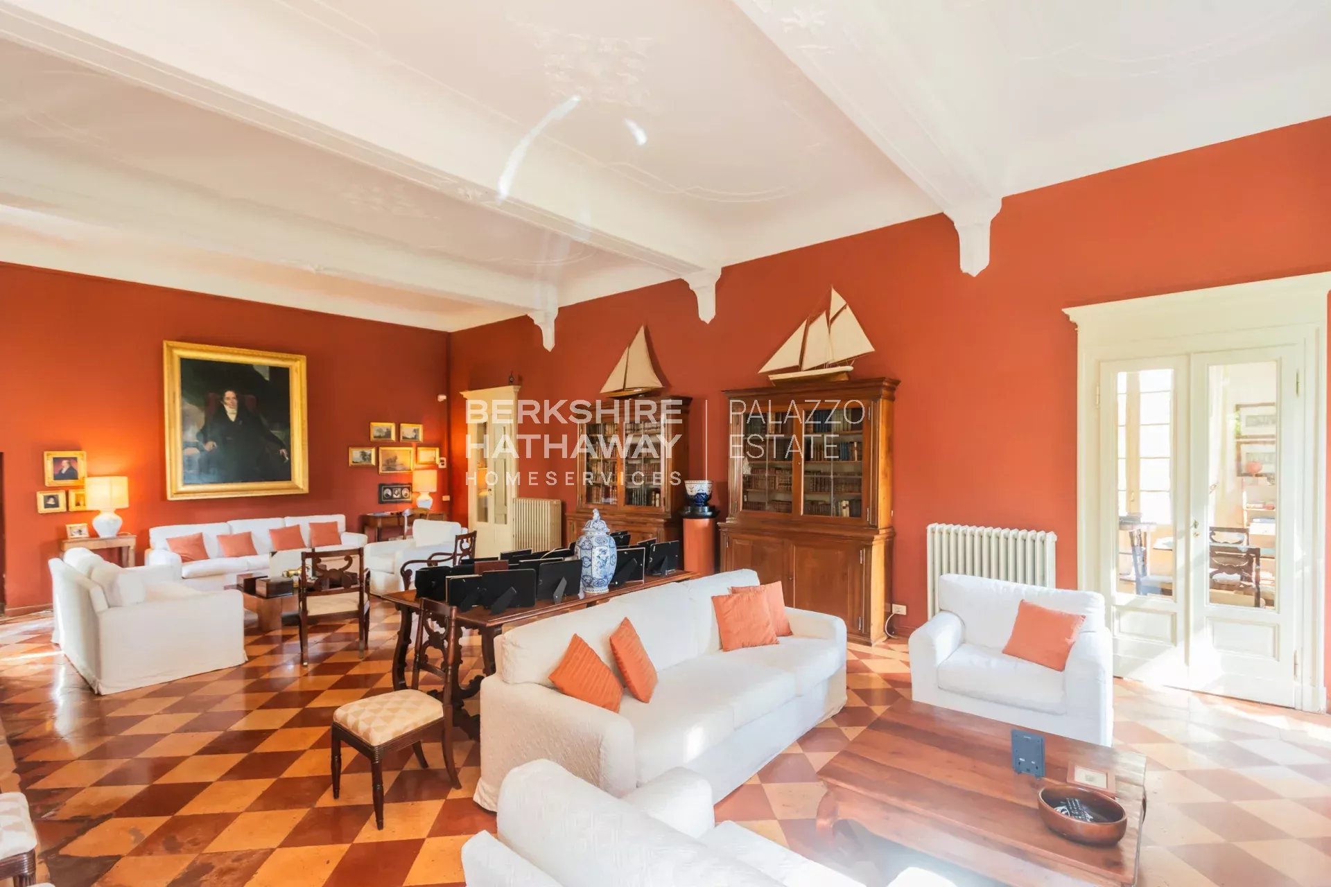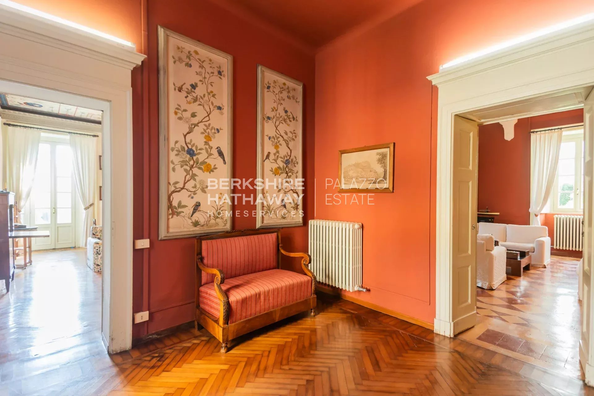 La villa principale si sviluppa su due livelli. L’atrio d’ingresso conduce alla zona living, articolata in tre ampi spazi di rappresentanza con soffitti affrescati e camini storici. Completano il piano giardino due sale da pranzo, due cucine di generose dimensioni, un bagno e numerosi locali di servizio. Il portico consente di organizzare cene all’aperto con una vista privilegiata sul parco. Uno scalone conduce alla zona notte, dove si trova l’appartamento padronale con ampia camera, cabina armadio, sala relax, zona fitness e bagno. Sulla medesima area si trovano otto camere con bagno en-suite, la sala biblioteca e una seconda cucina con sala da pranzo. Il piano è arricchito da sette balconi che si affacciano sul parco e sul panorama fino a Milano.