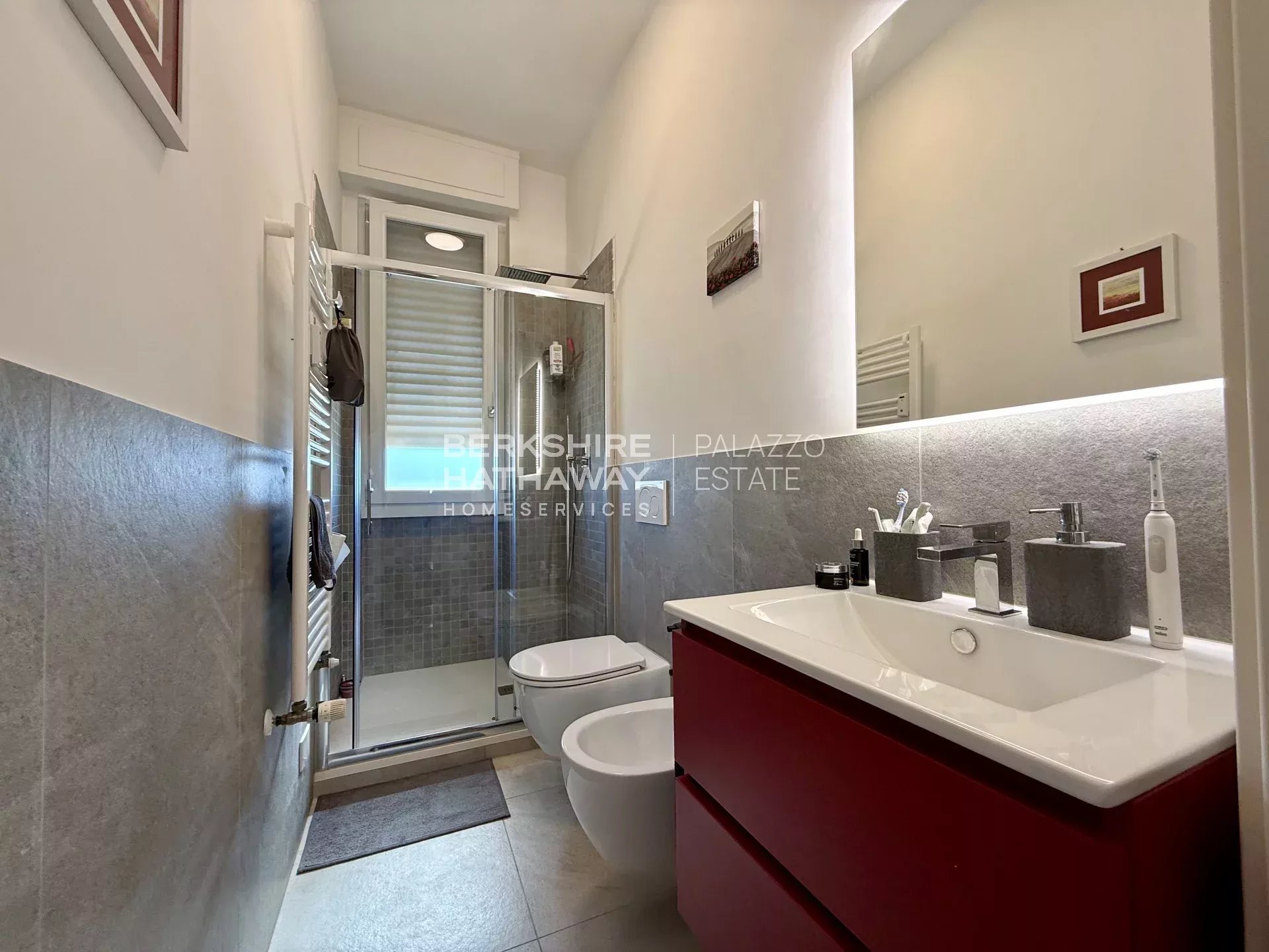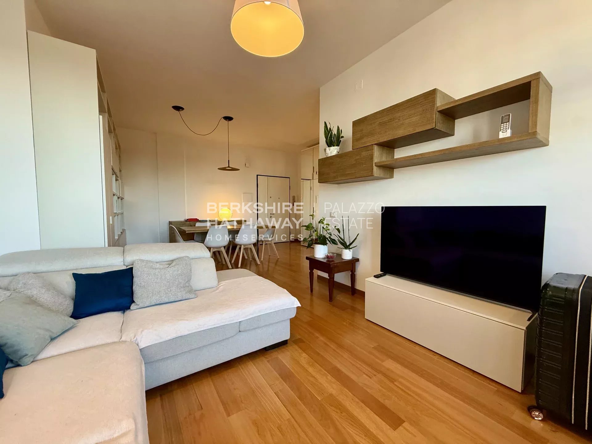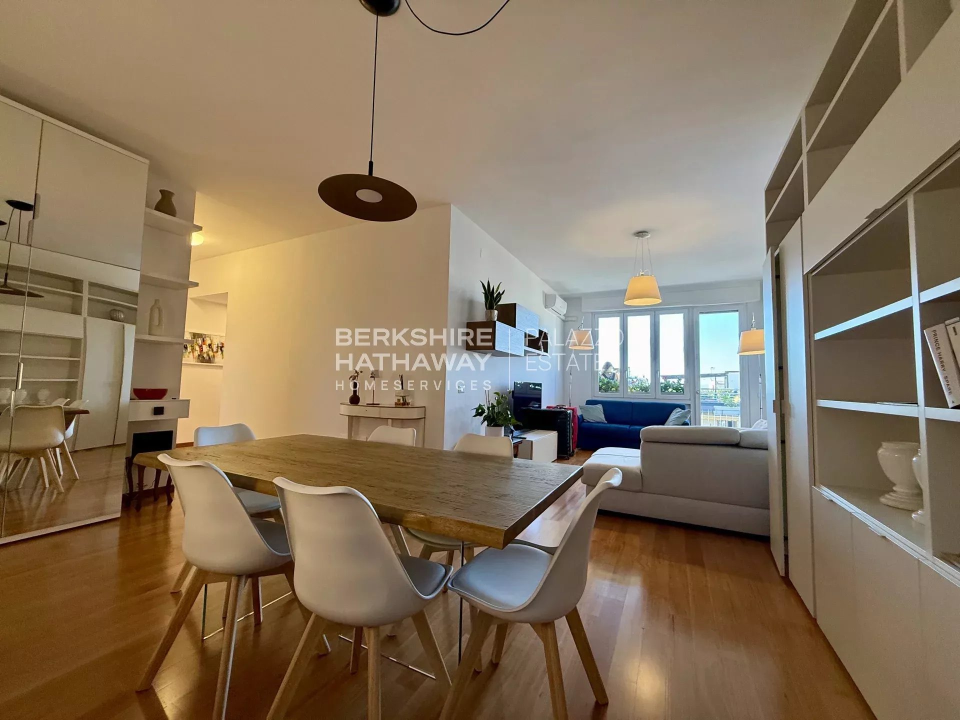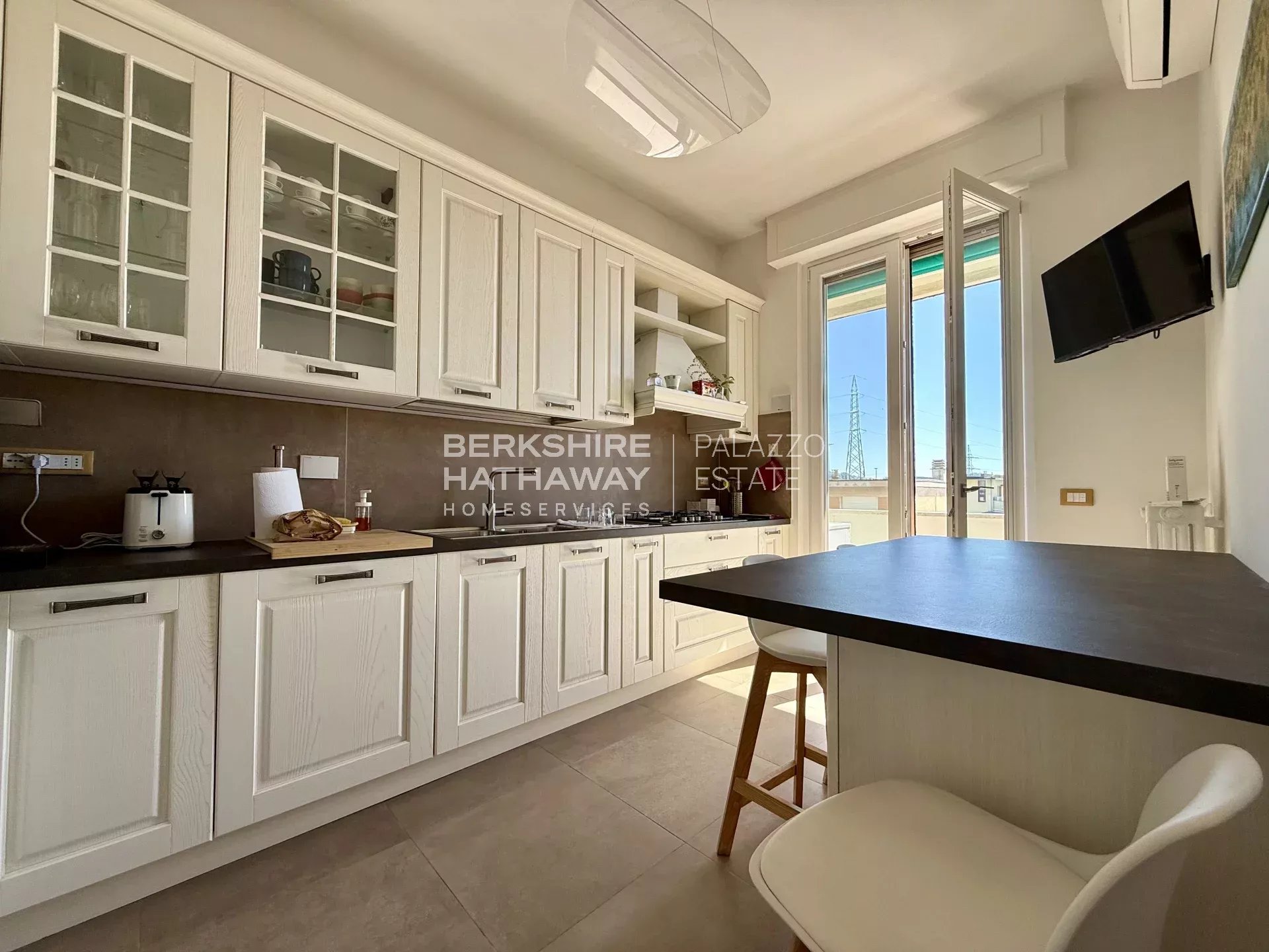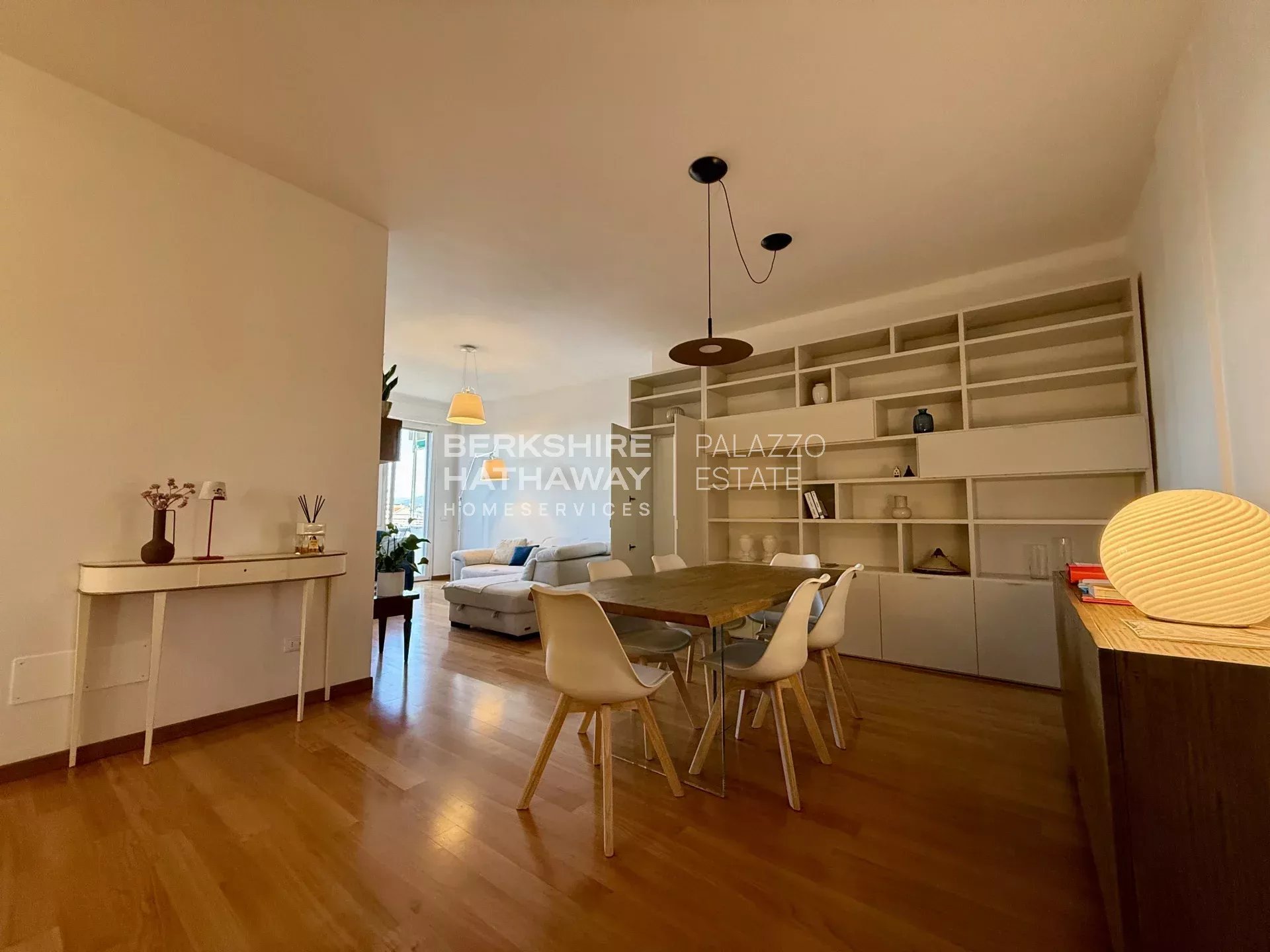 L’immobile, recentemente ristrutturato con finiture di pregio, è completamente arredato con mobili moderni di alta qualità (tra cui arredi Flou), ed è composto da un ampio soggiorno con zona pranzo, cucina abitabile, due camere matrimoniali, doppi servizi, un pratico vano di servizio e una terza camerina ricavata in modo discreto e funzionale dietro la libreria del soggiorno.