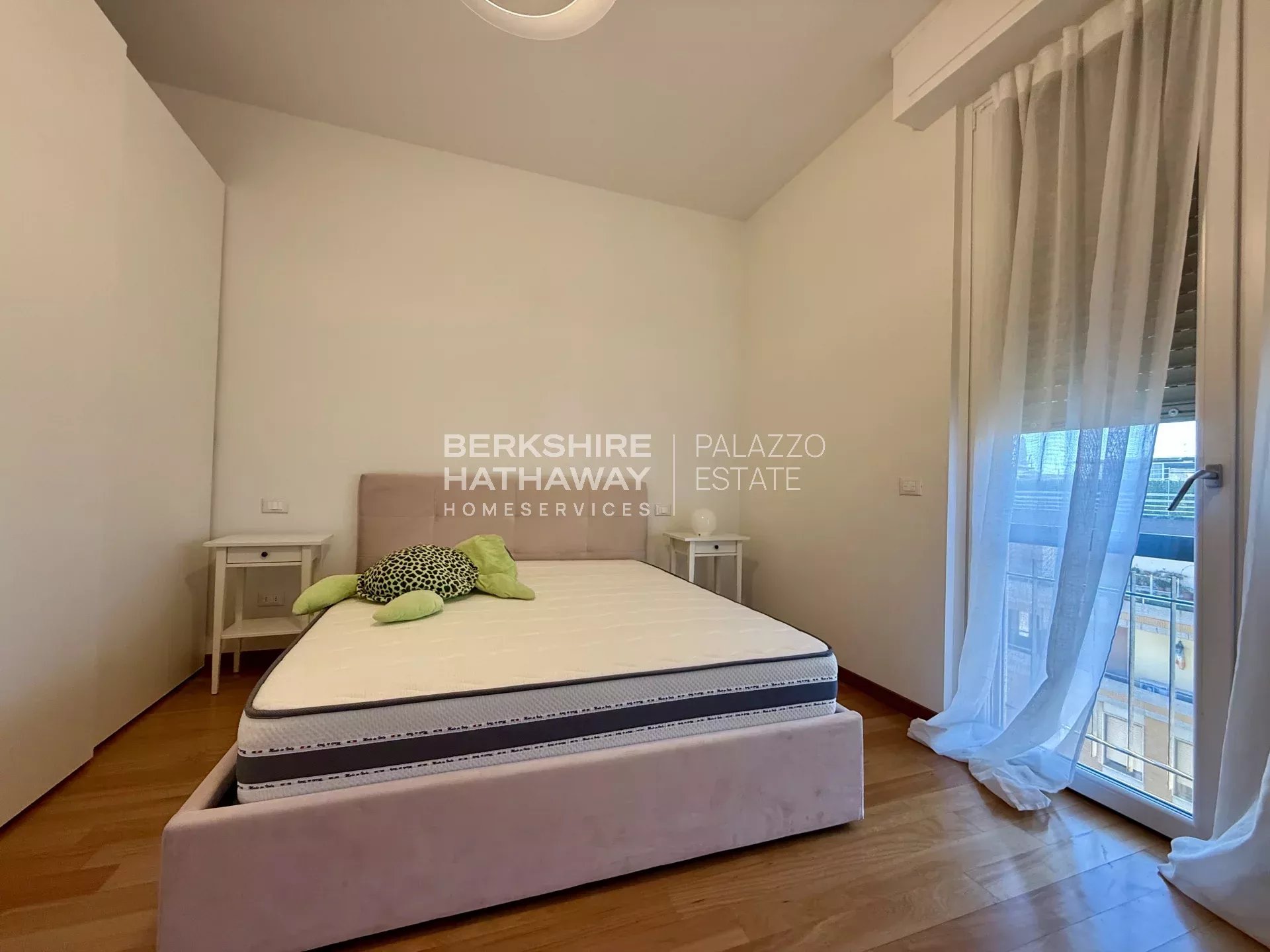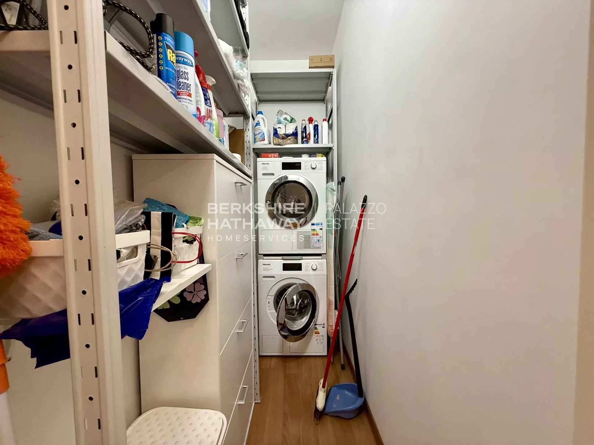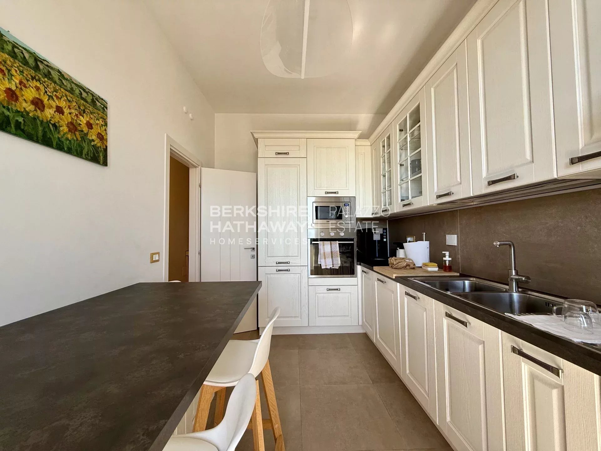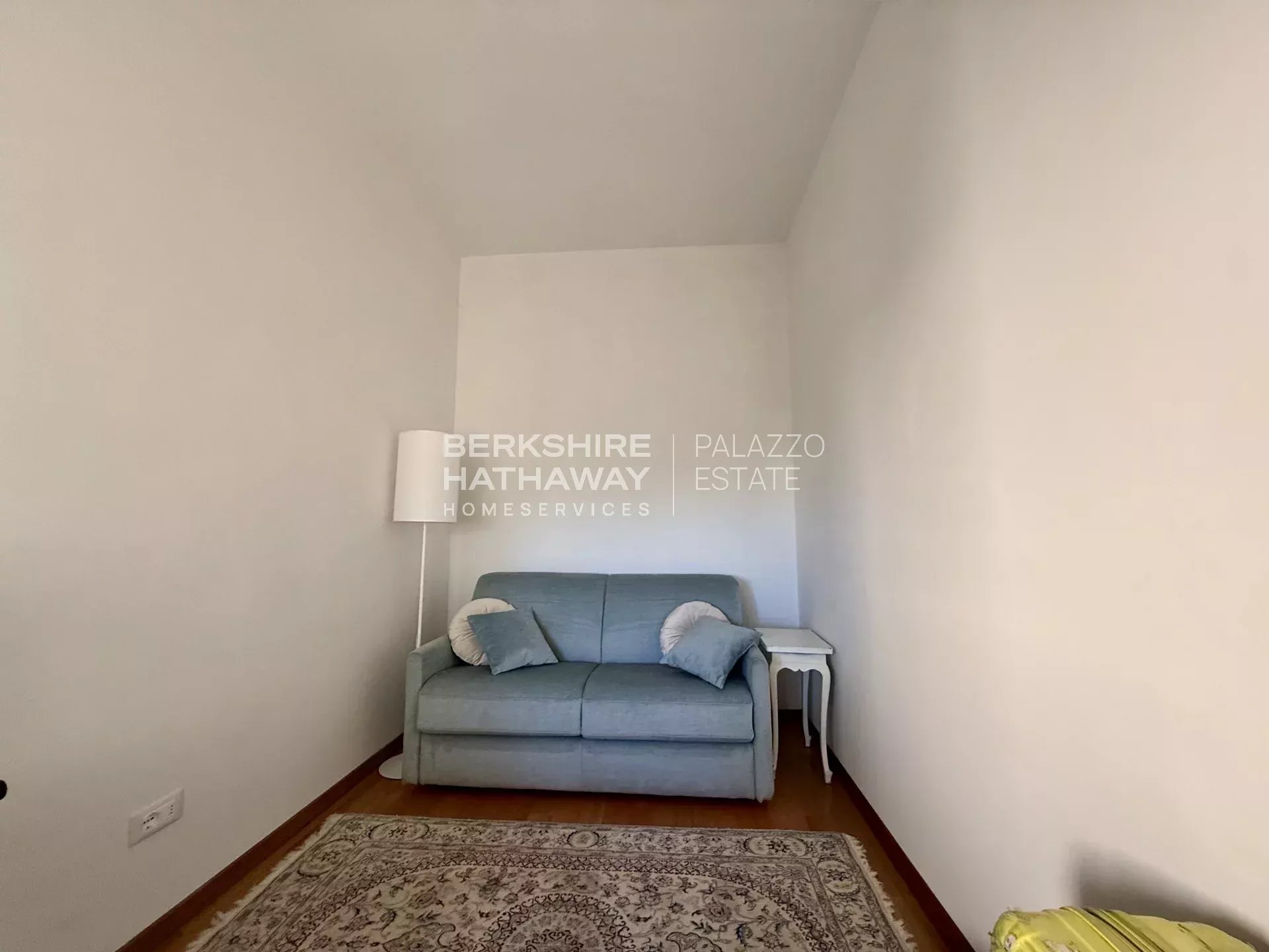 L’immobile, recentemente ristrutturato con finiture di pregio, è completamente arredato con mobili moderni di alta qualità (tra cui arredi Flou), ed è composto da un ampio soggiorno con zona pranzo, cucina abitabile, due camere matrimoniali, doppi servizi, un pratico vano di servizio e una terza camerina ricavata in modo discreto e funzionale dietro la libreria del soggiorno.