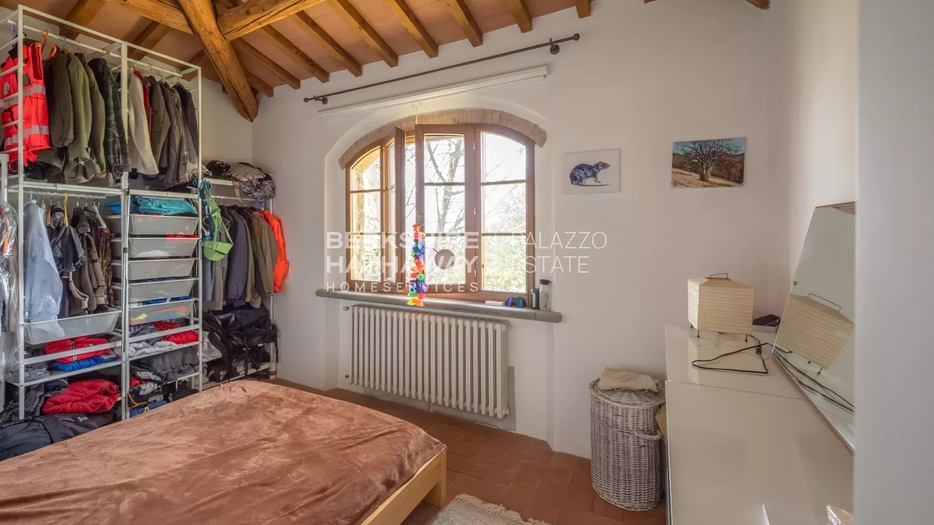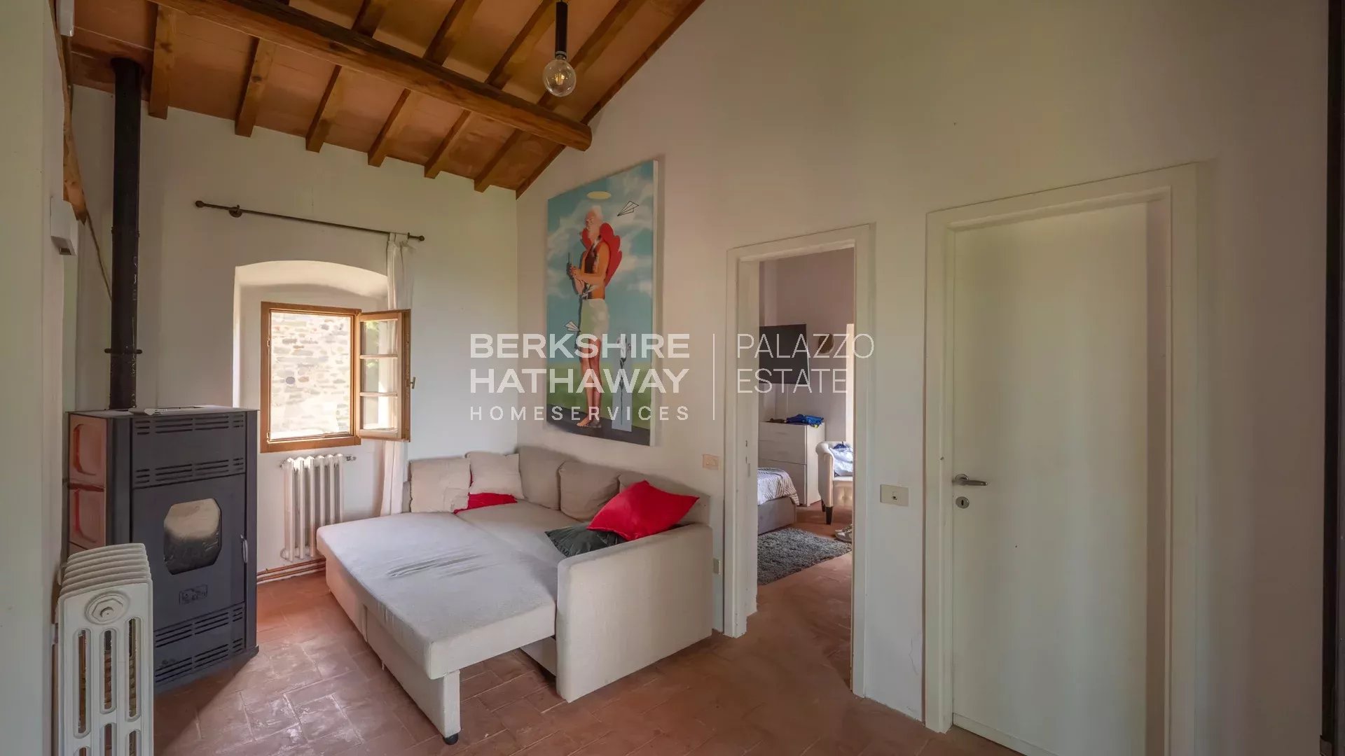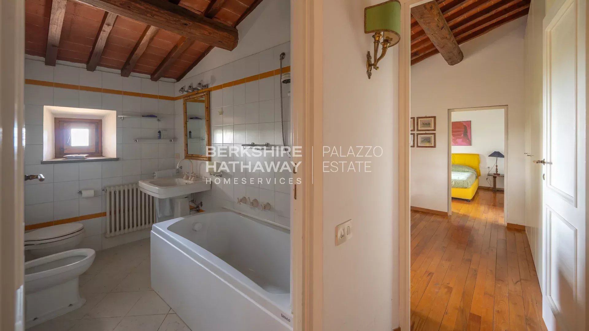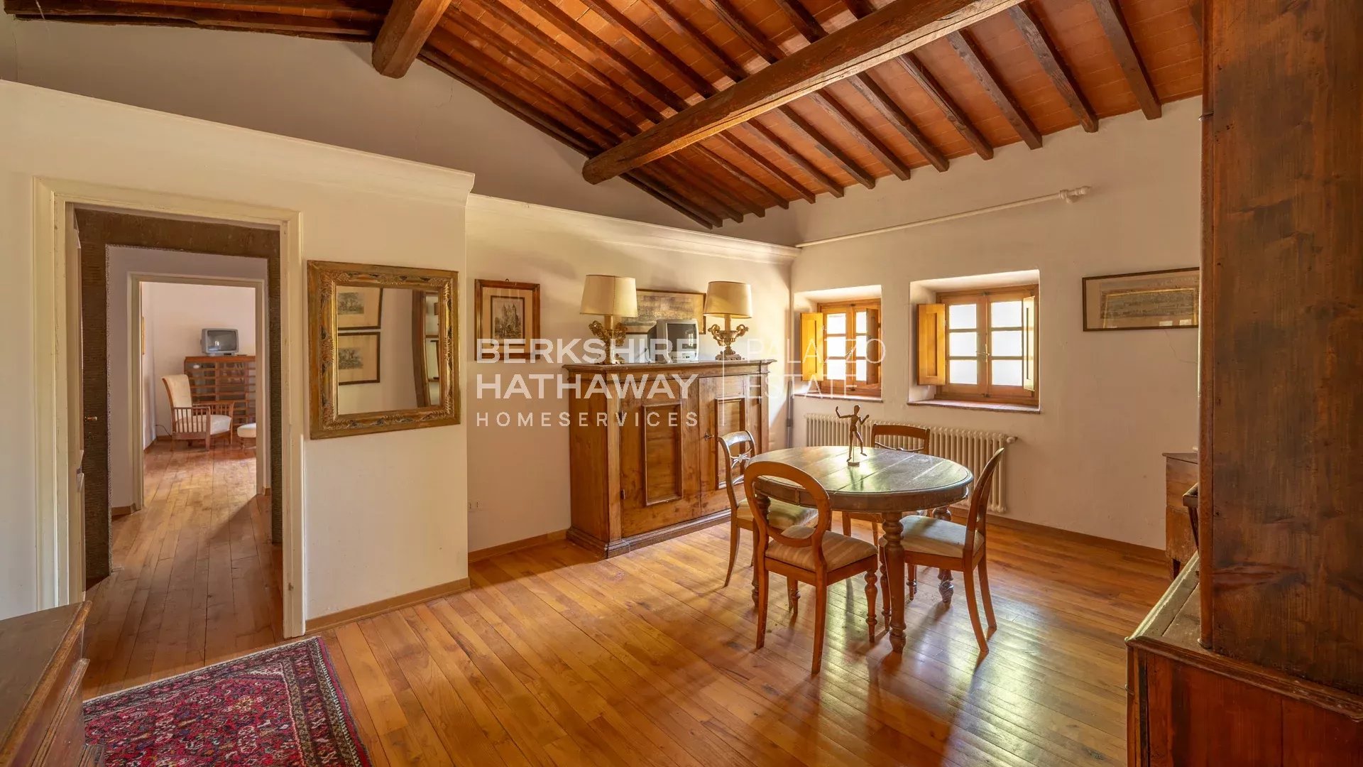 Il casale principale di circa 450 mq, distribuito su due livelli, accoglie al piano terra una zona giorno ampia e ben articolata, con sala da pranzo, cucina, doppio soggiorno con camino e accesso diretto sia al portico che alla loggia.