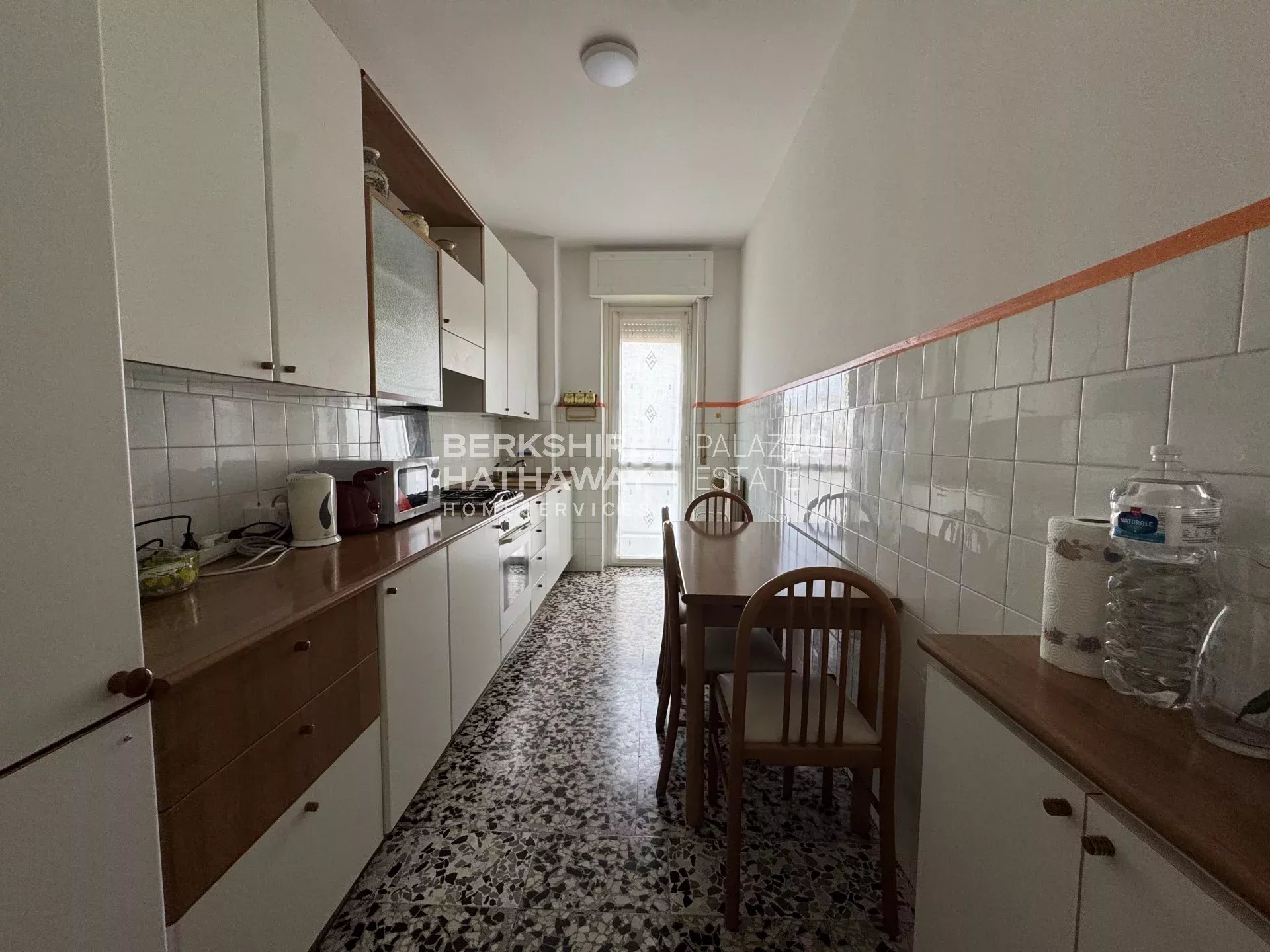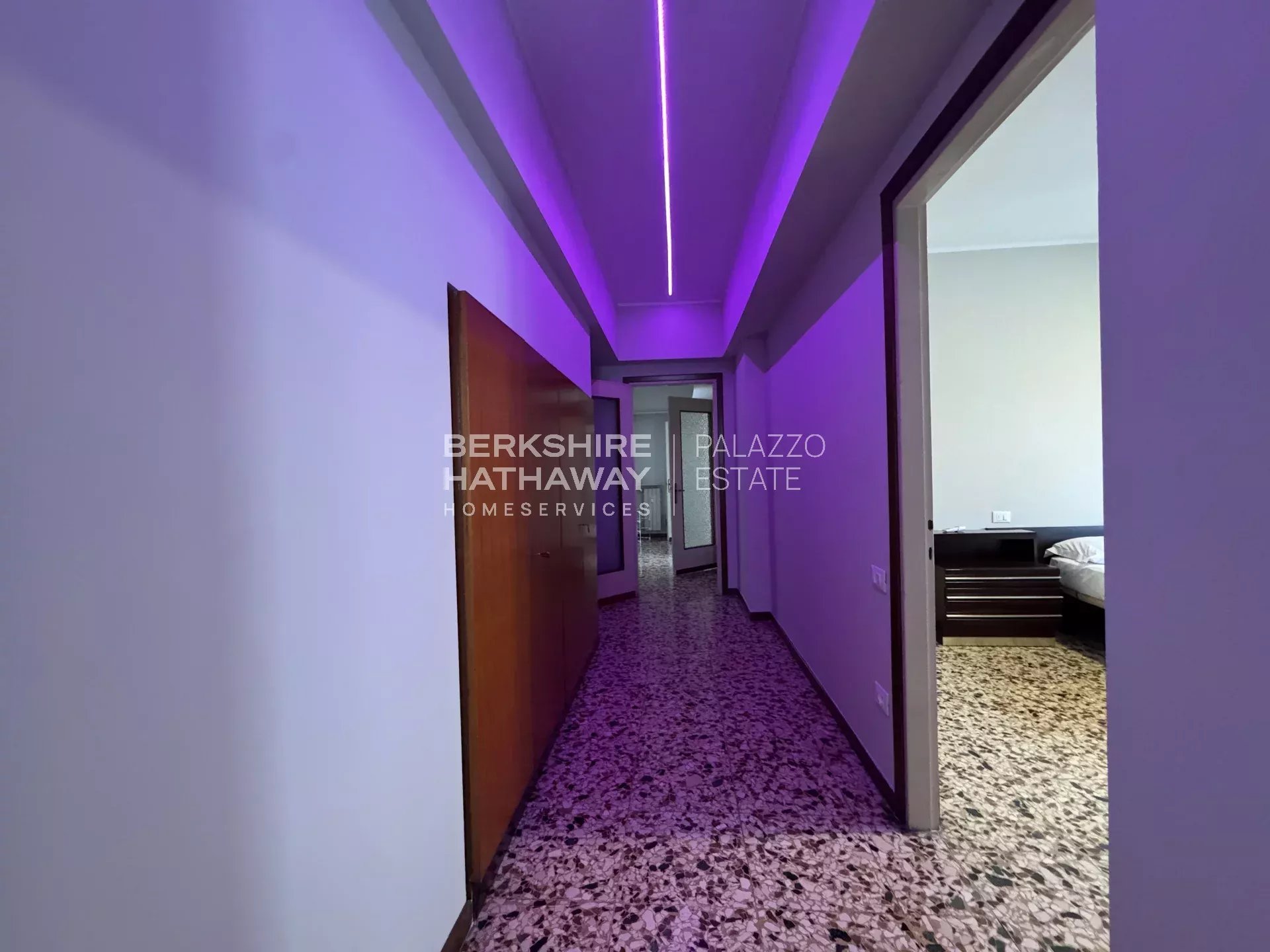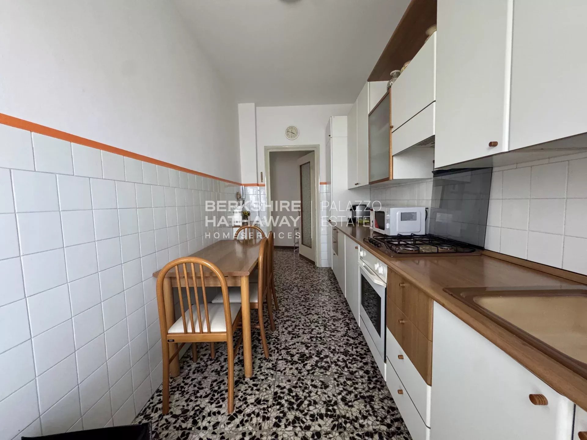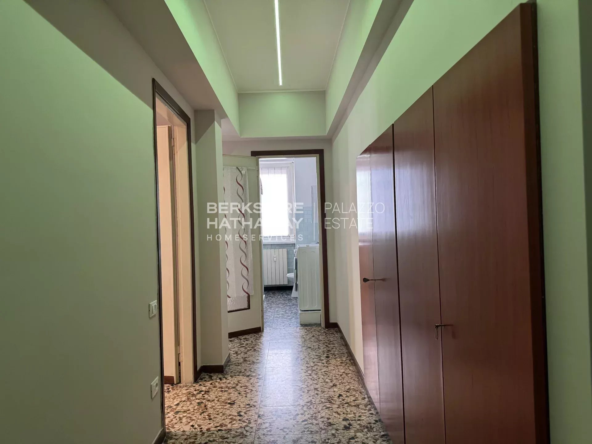 L’appartamento, di circa 100 mq, si apre su un ingresso che conduce a una cucina abitabile con balcone e a un luminoso soggiorno, anch’esso dotato di balcone. La zona notte comprende due camere matrimoniali, un bagno finestrato con doccia, un pratico ripostiglio e un corridoio con armadiature su misura.