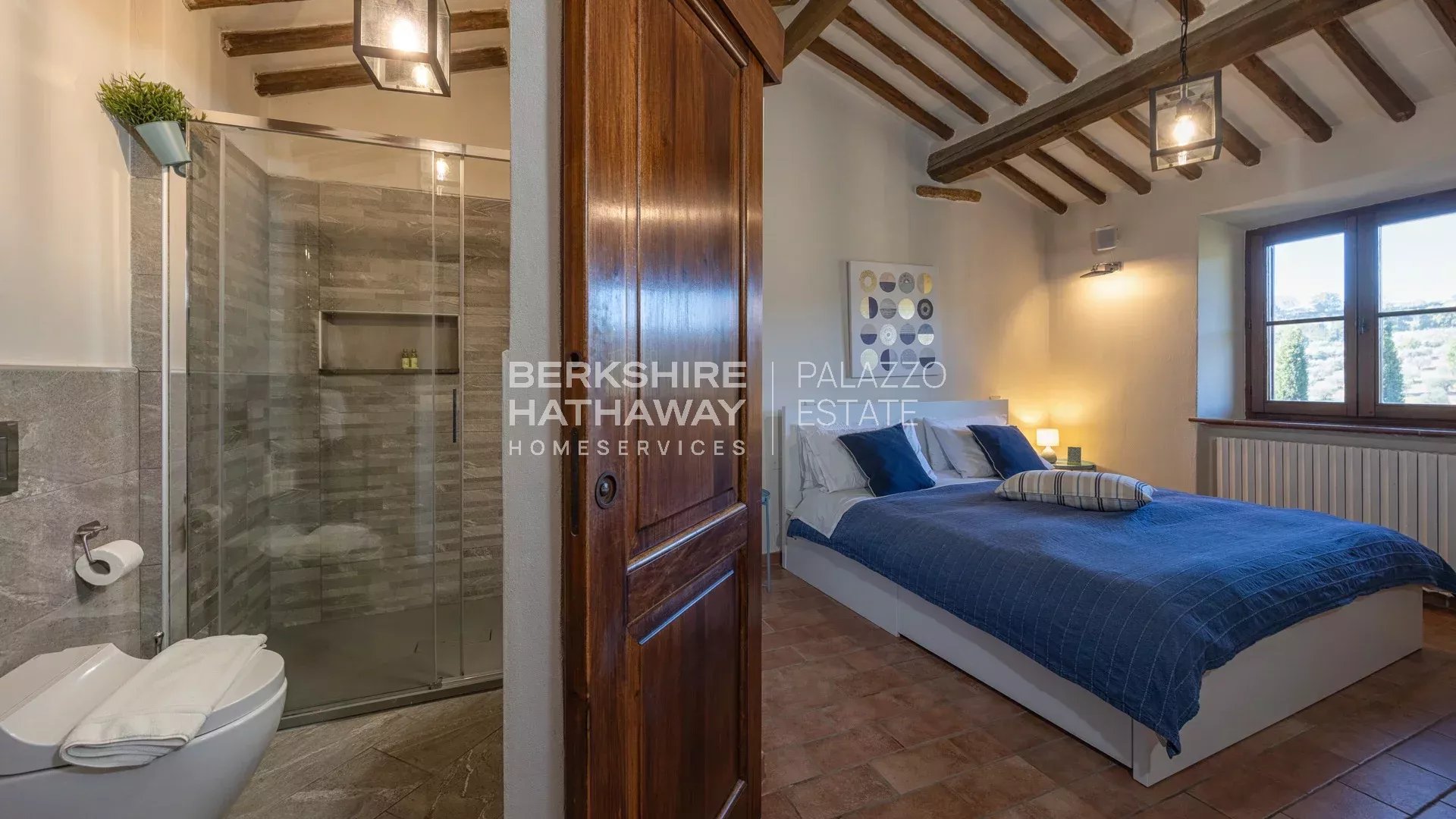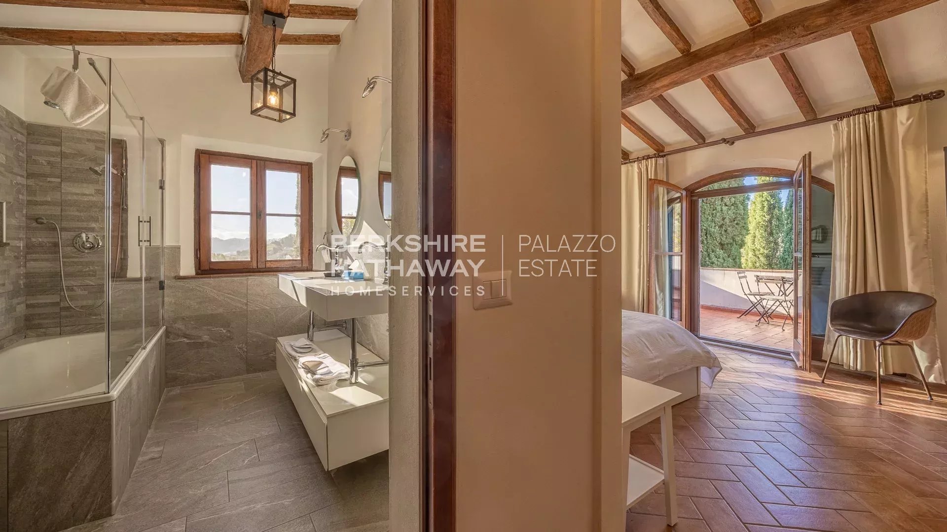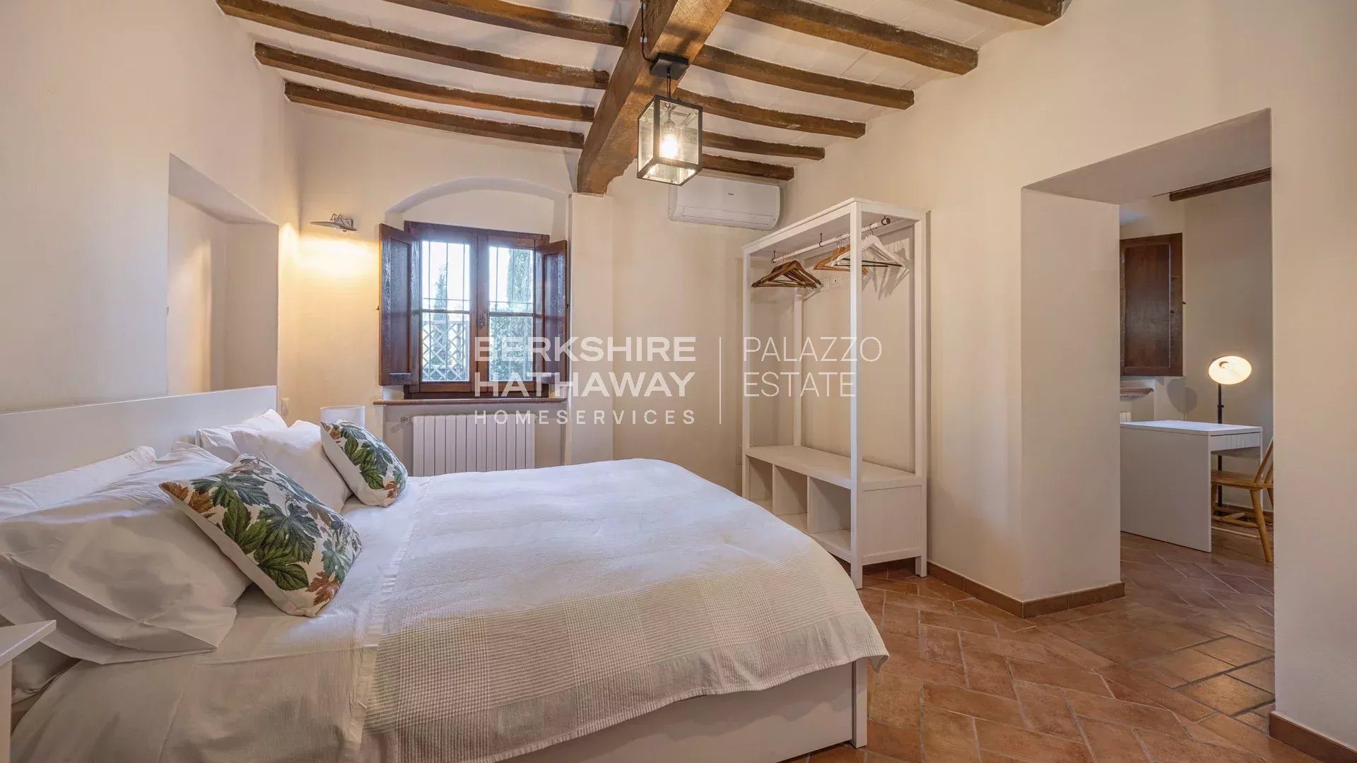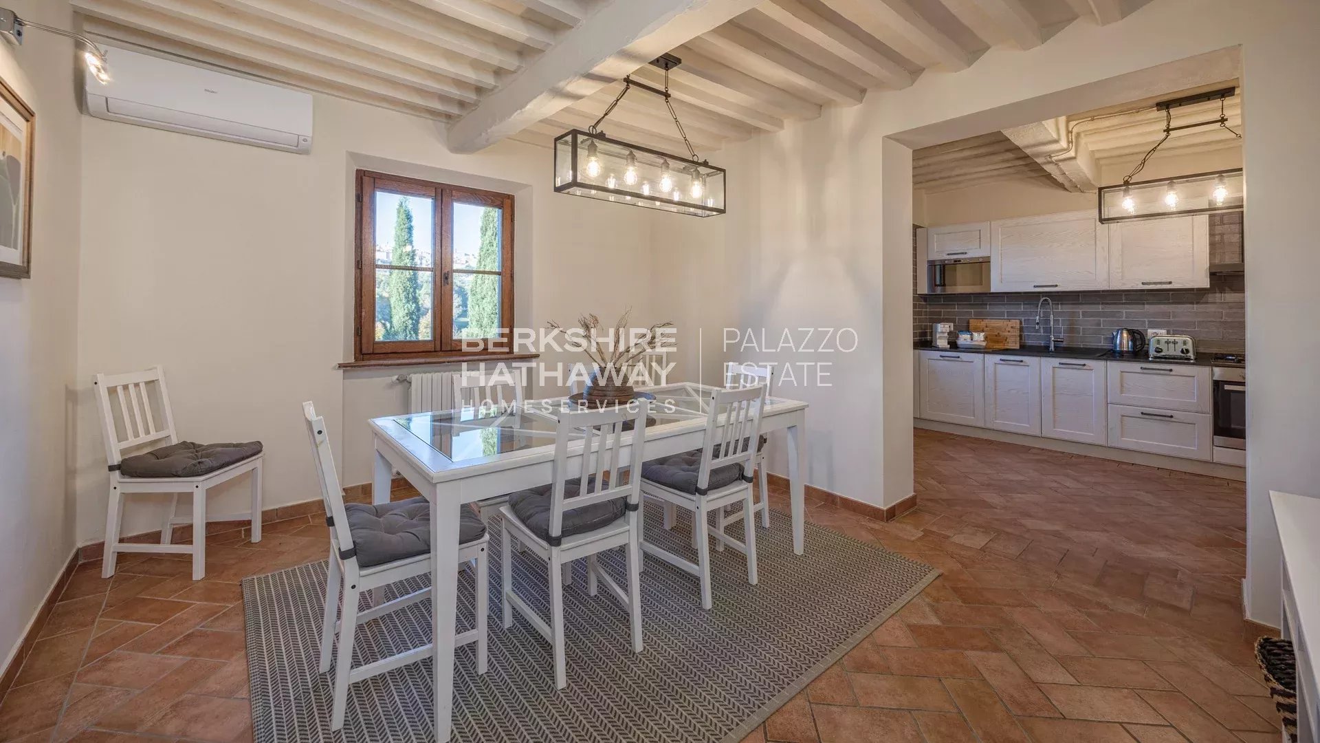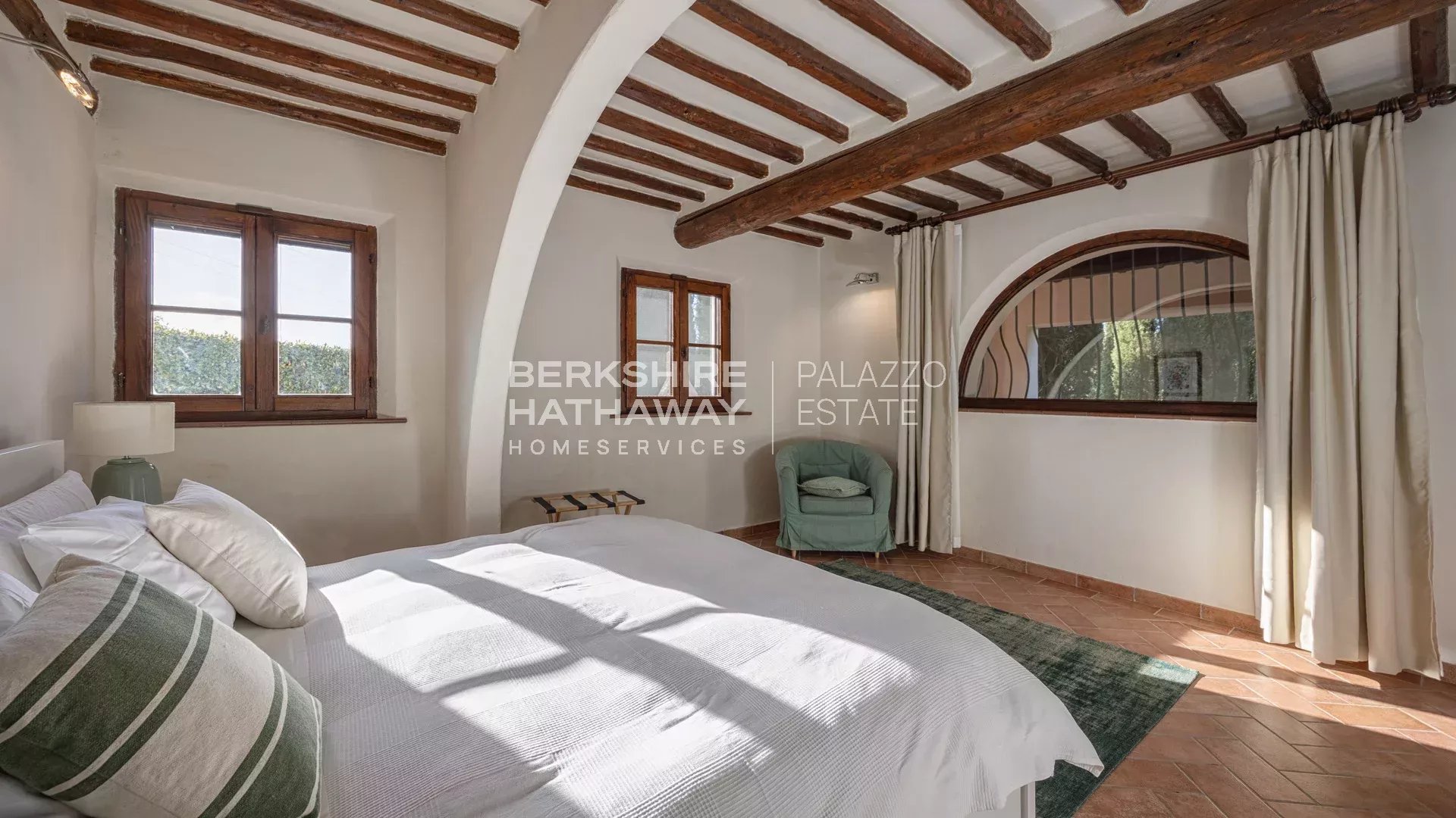 Questa splendida dimora, raggiungibile attraverso una suggestiva breve strada bianca incorniciata dai tipici cipressi toscani, vanta una posizione dominante e molto panoramica con una magnifica vista su Montepulciano.