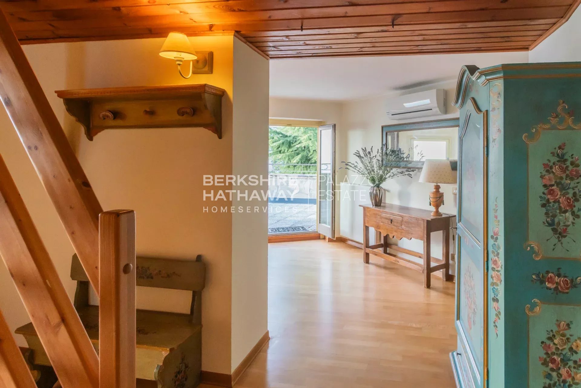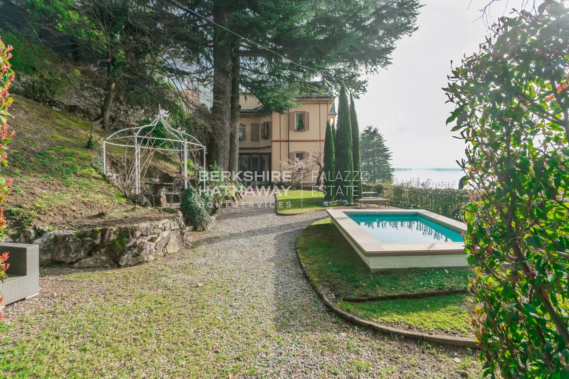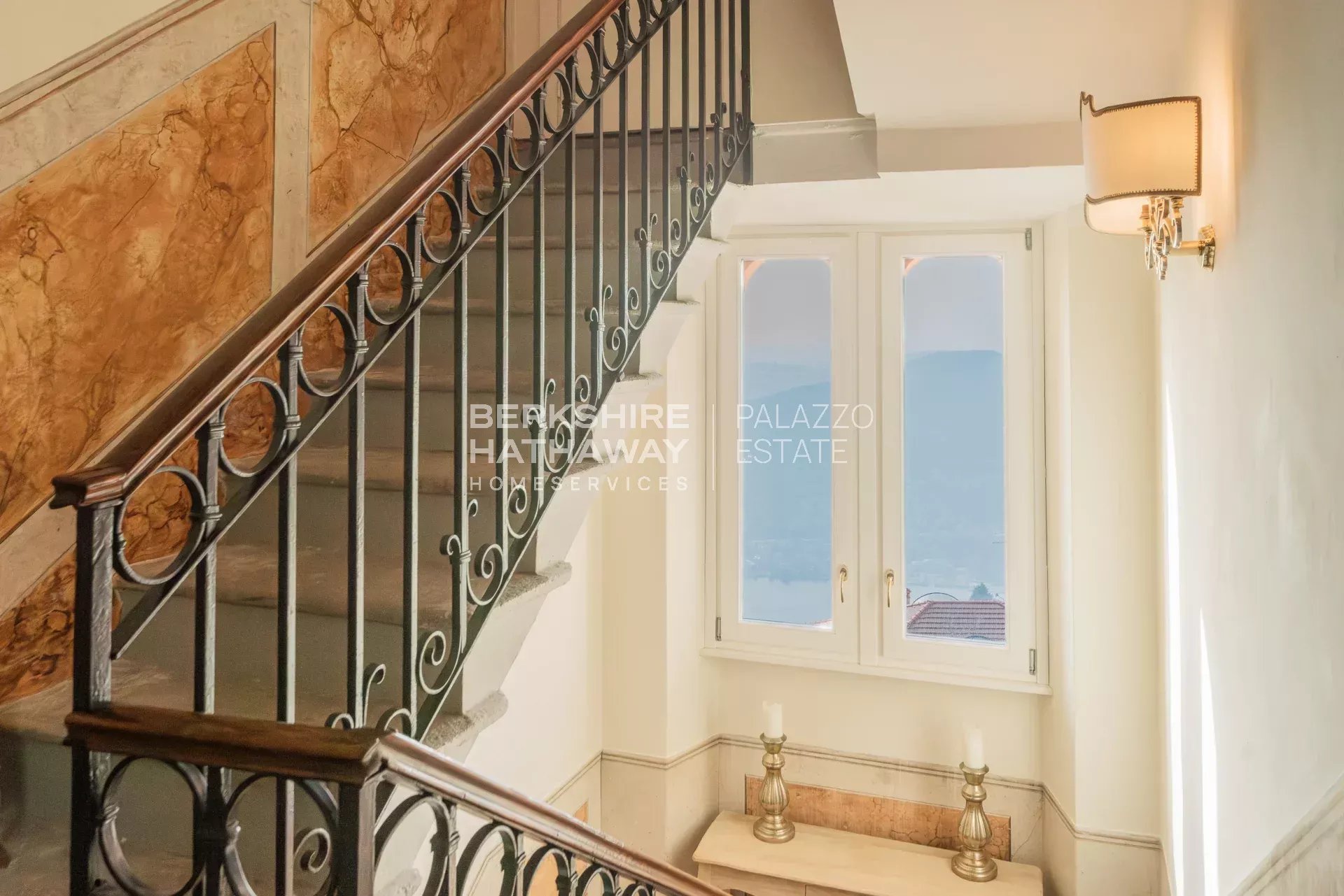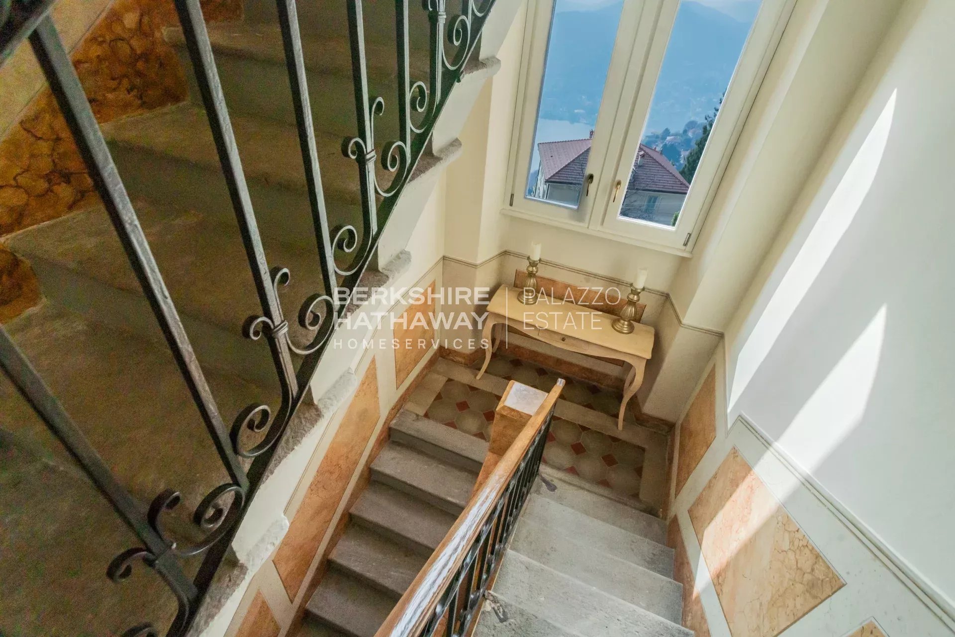 Il piano terreno ospita un soggiorno con affacci sul giardino, una cucina attrezzata e un bagno. Il primo piano, collegato dalla scenografica scala in marmo, accoglie tre camere da letto, ciascuna con bagno en-suite e balcone, con viste aperte verso il lago e le montagne circostanti.