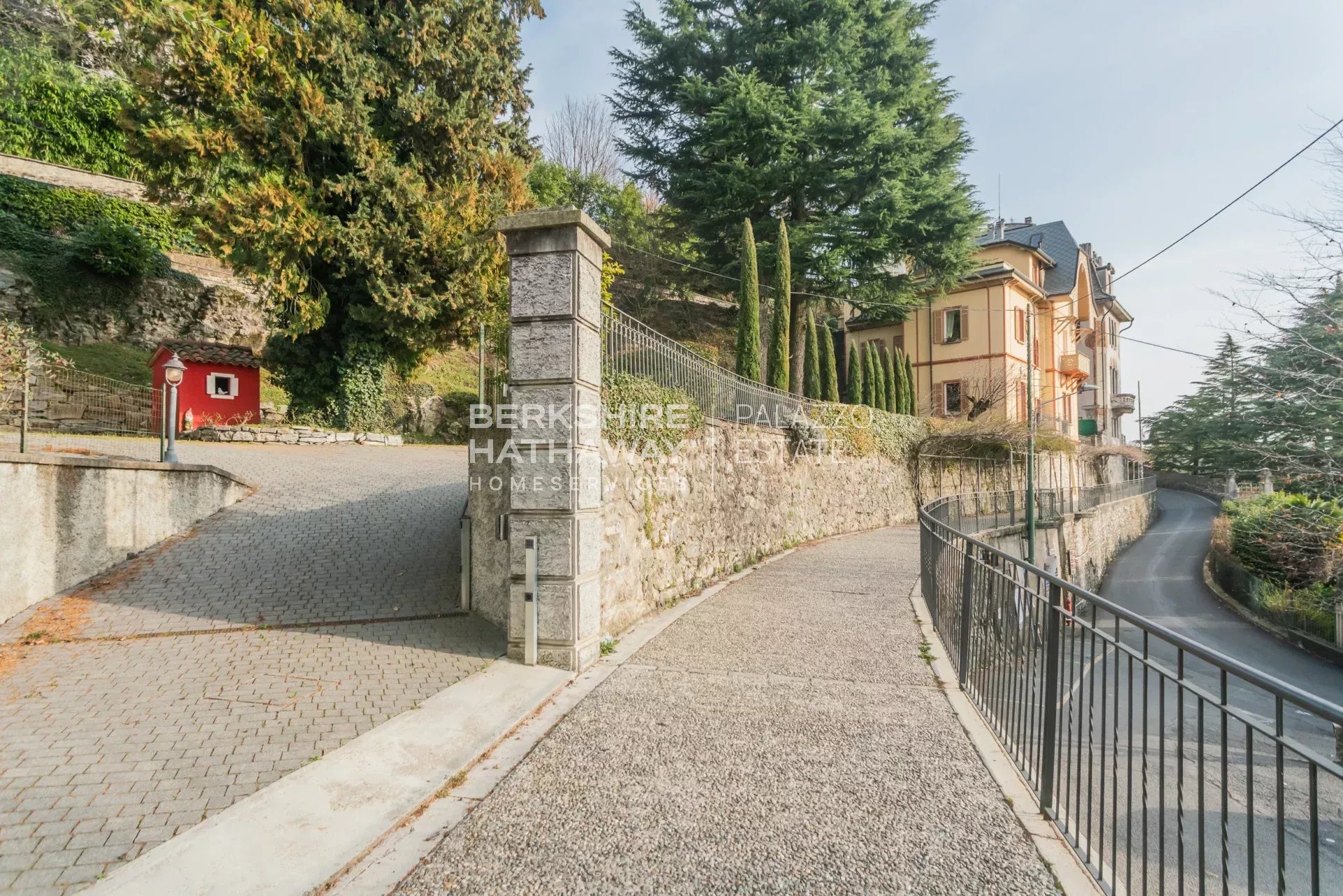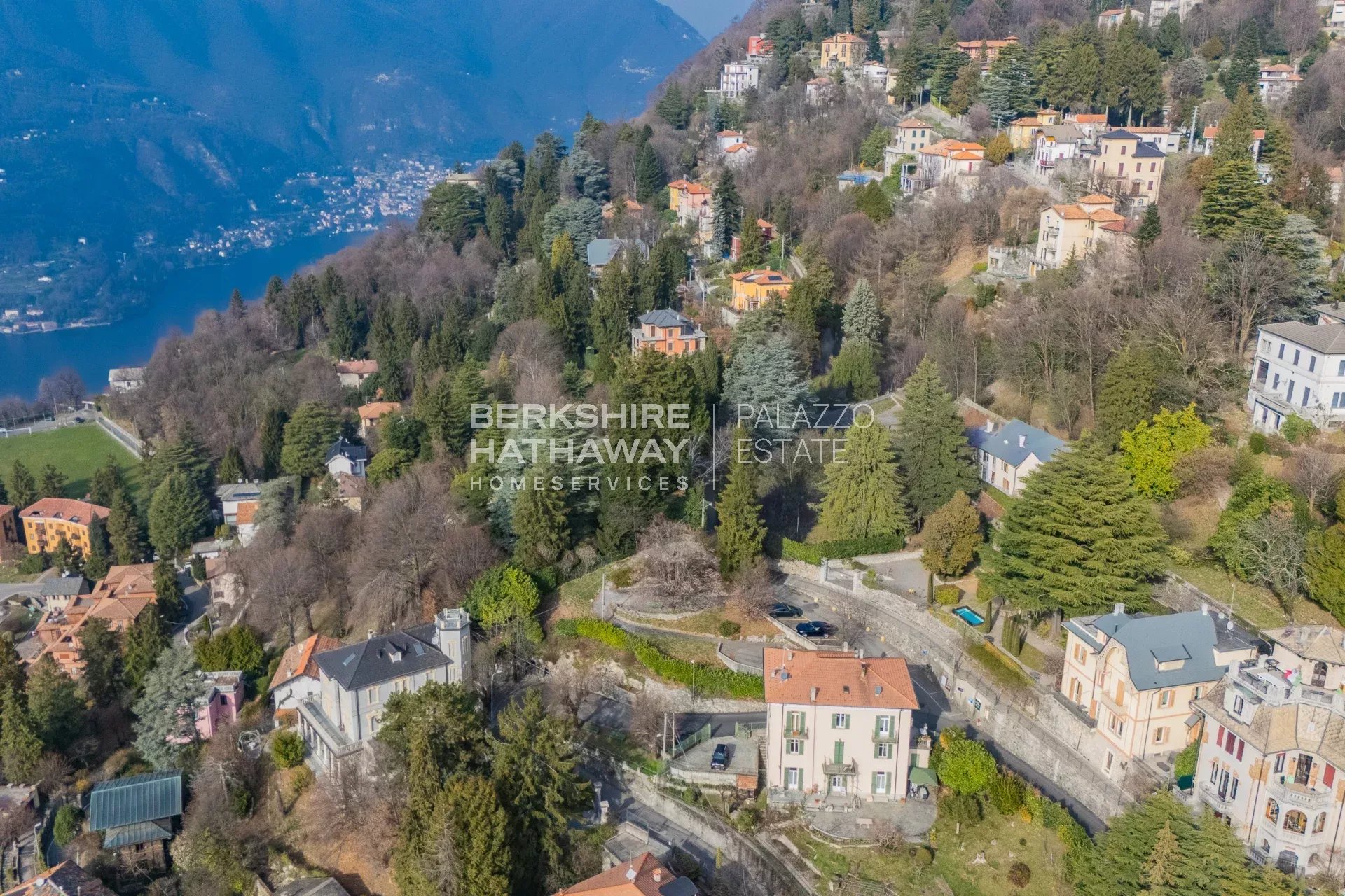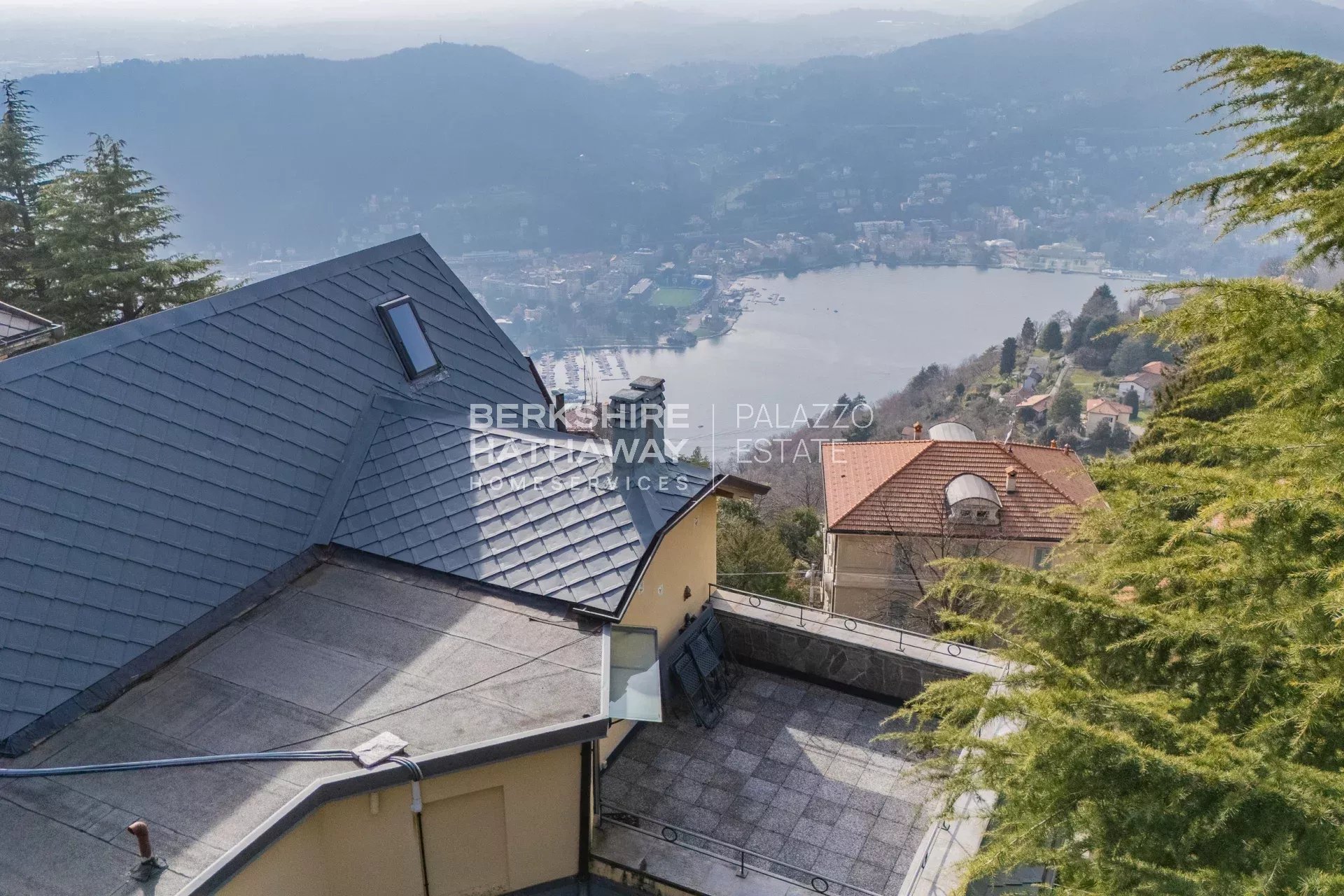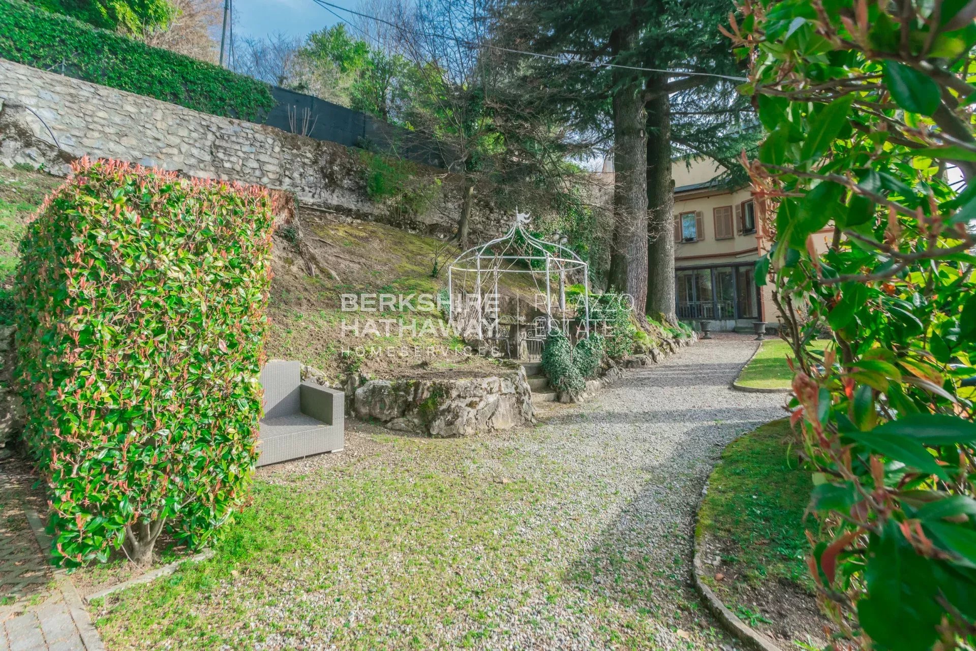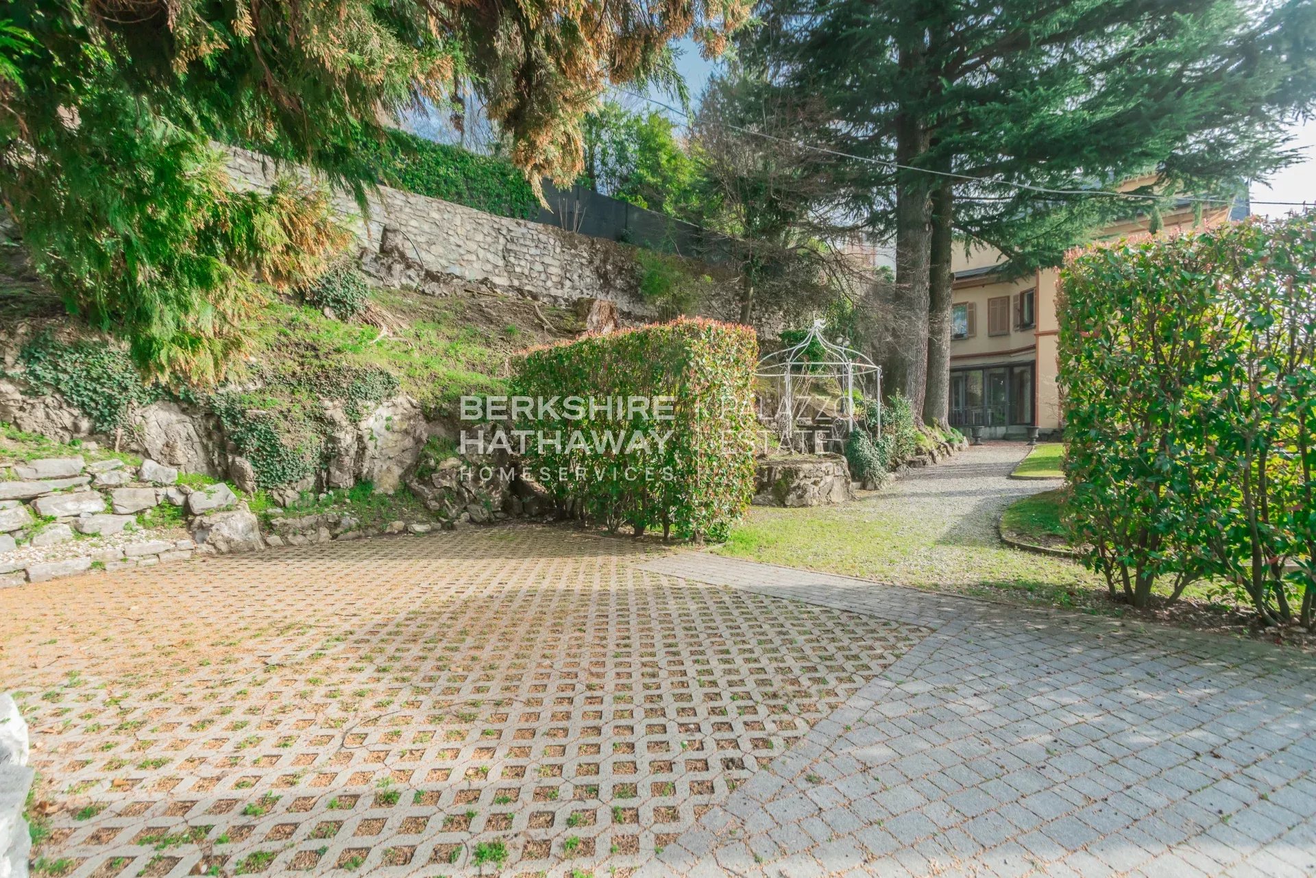 La proprietà è inserita in un giardino pianeggiante di circa 1.000 mq, arricchito da alberi ad alto fusto, aiuole fiorite e spazi dedicati alla quiete. Un gazebo e terrazze panoramiche accompagnano lo sguardo verso il lago di Como, il centro della città e l’arco alpino, dove nelle giornate limpide emerge il profilo del Monte Rosa.