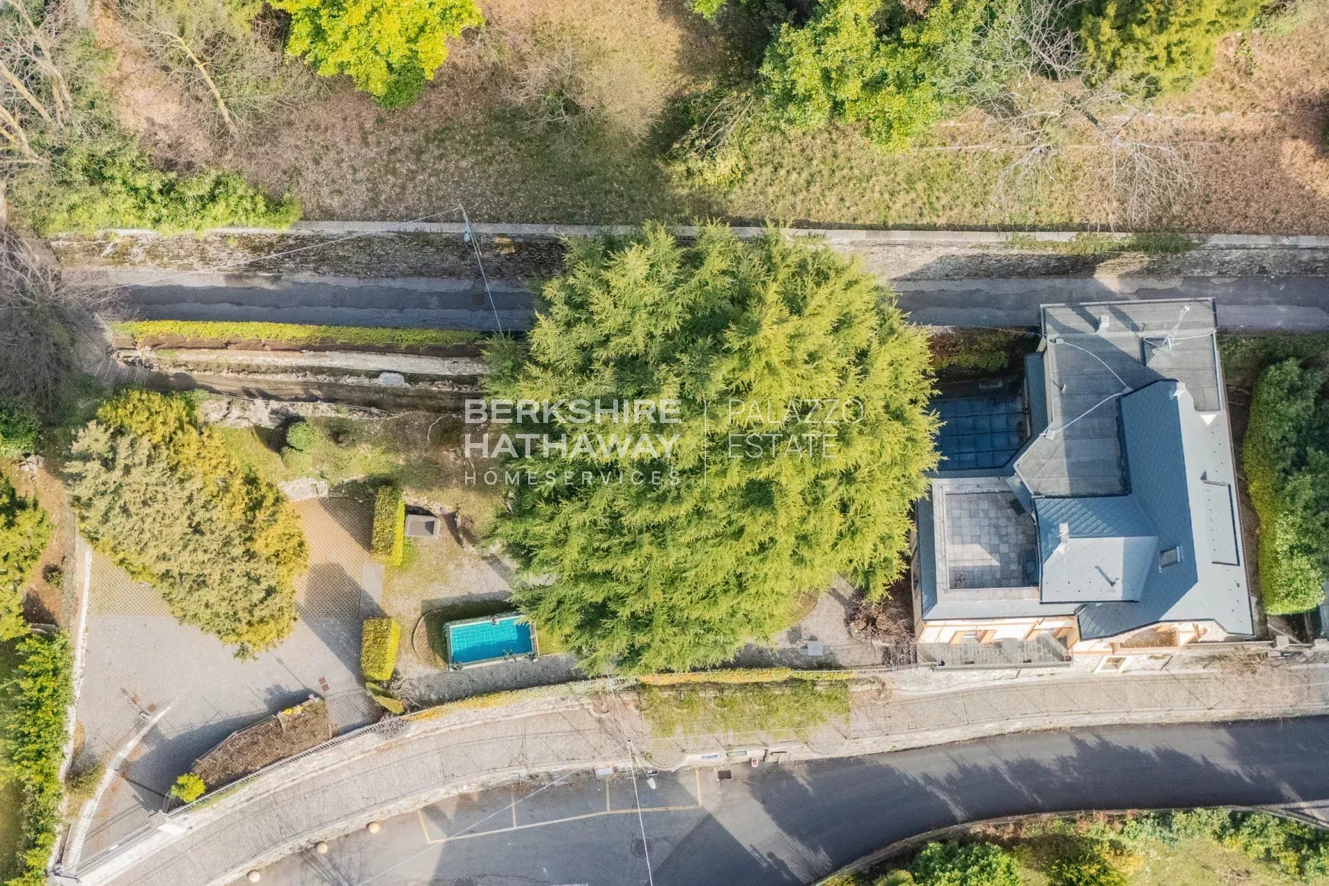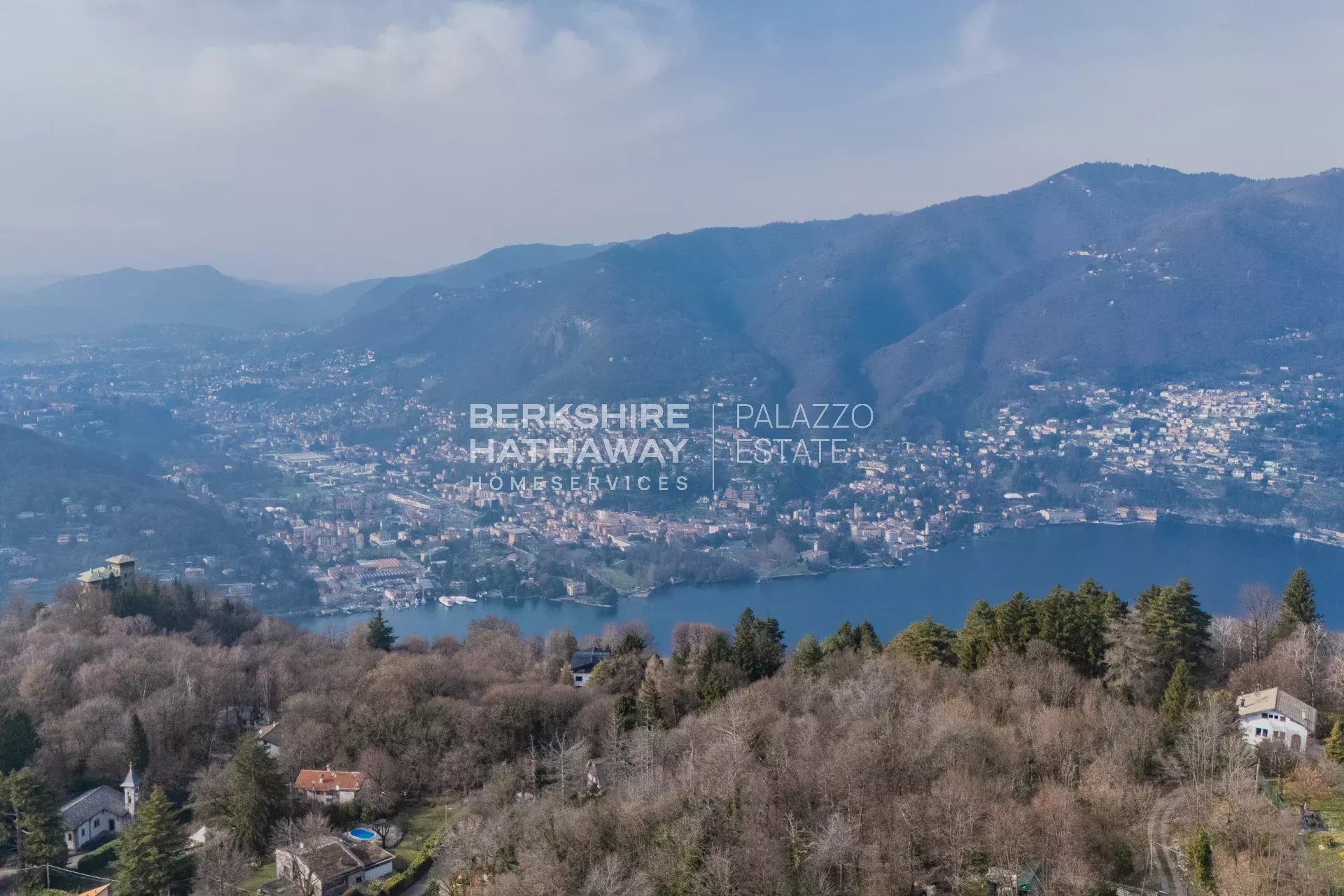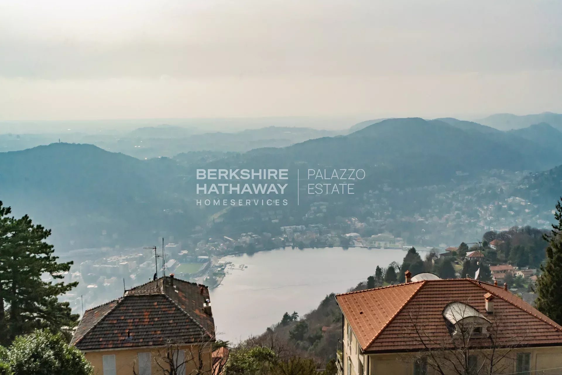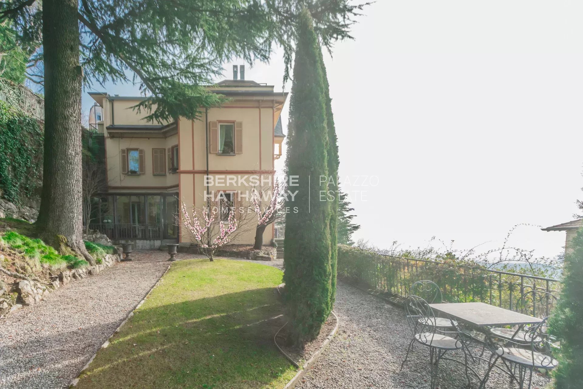 La proprietà è inserita in un giardino pianeggiante di circa 1.000 mq, arricchito da alberi ad alto fusto, aiuole fiorite e spazi dedicati alla quiete. Un gazebo e terrazze panoramiche accompagnano lo sguardo verso il lago di Como, il centro della città e l’arco alpino, dove nelle giornate limpide emerge il profilo del Monte Rosa.