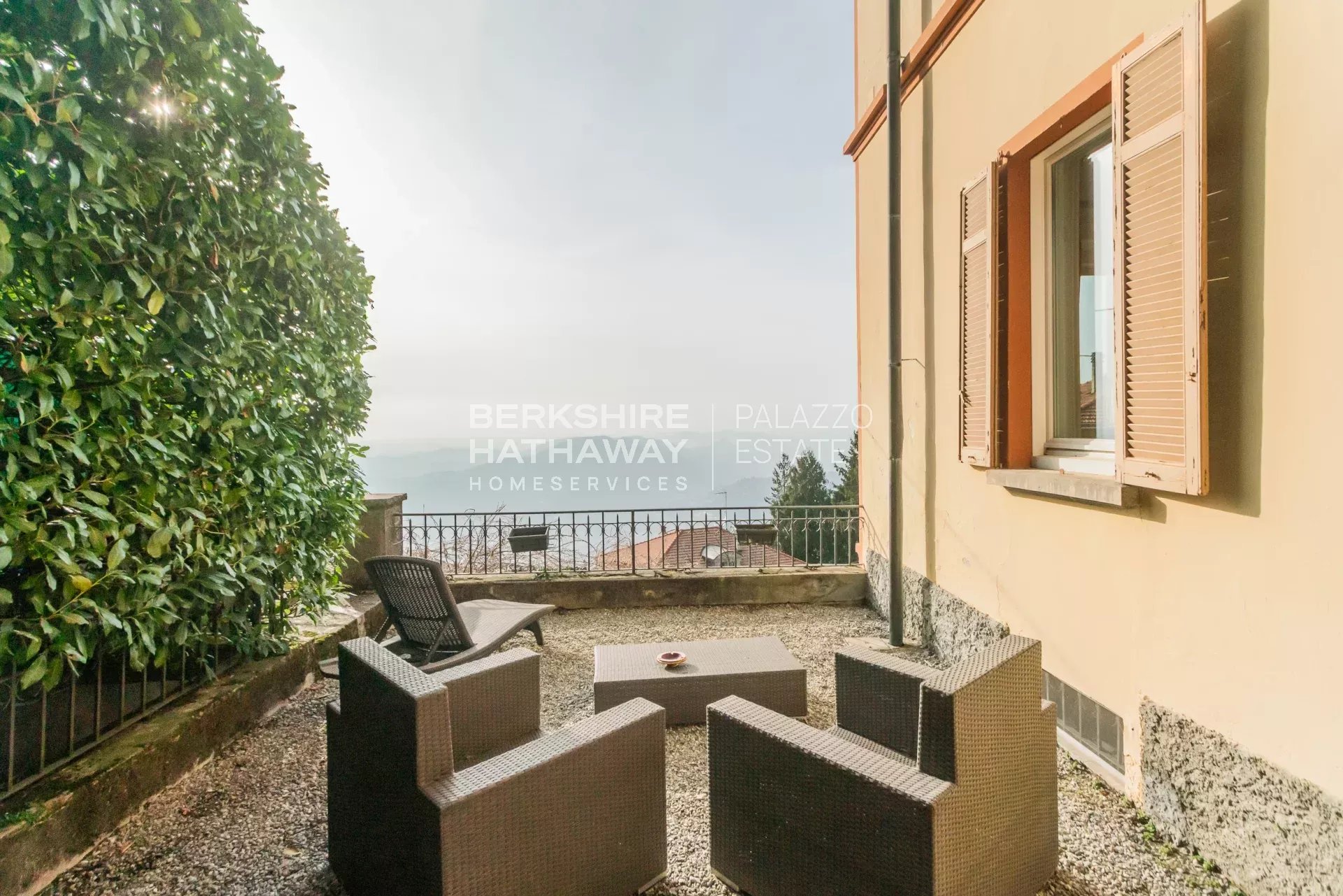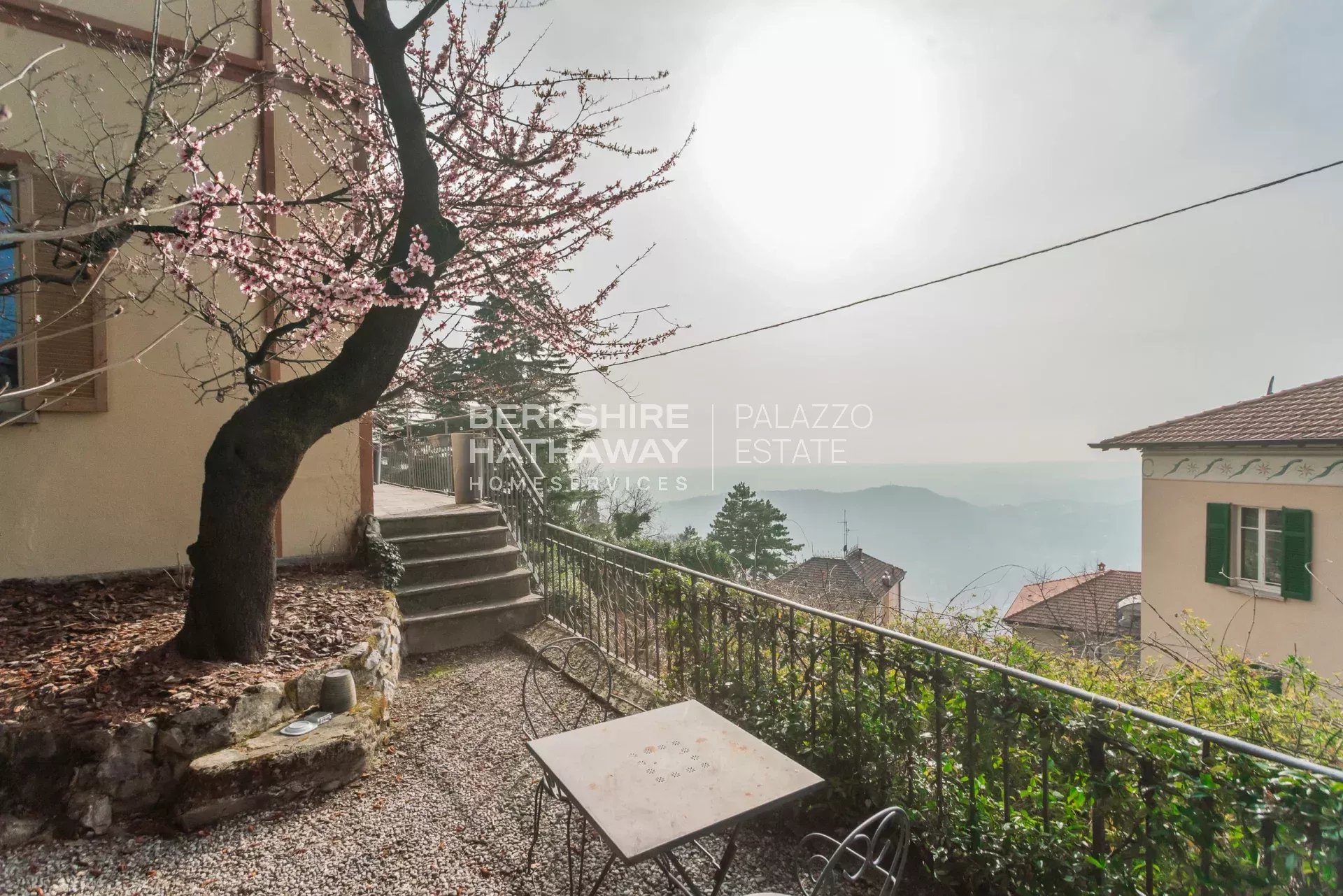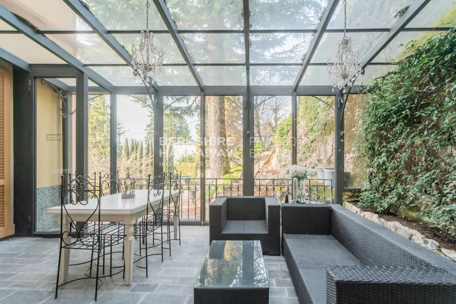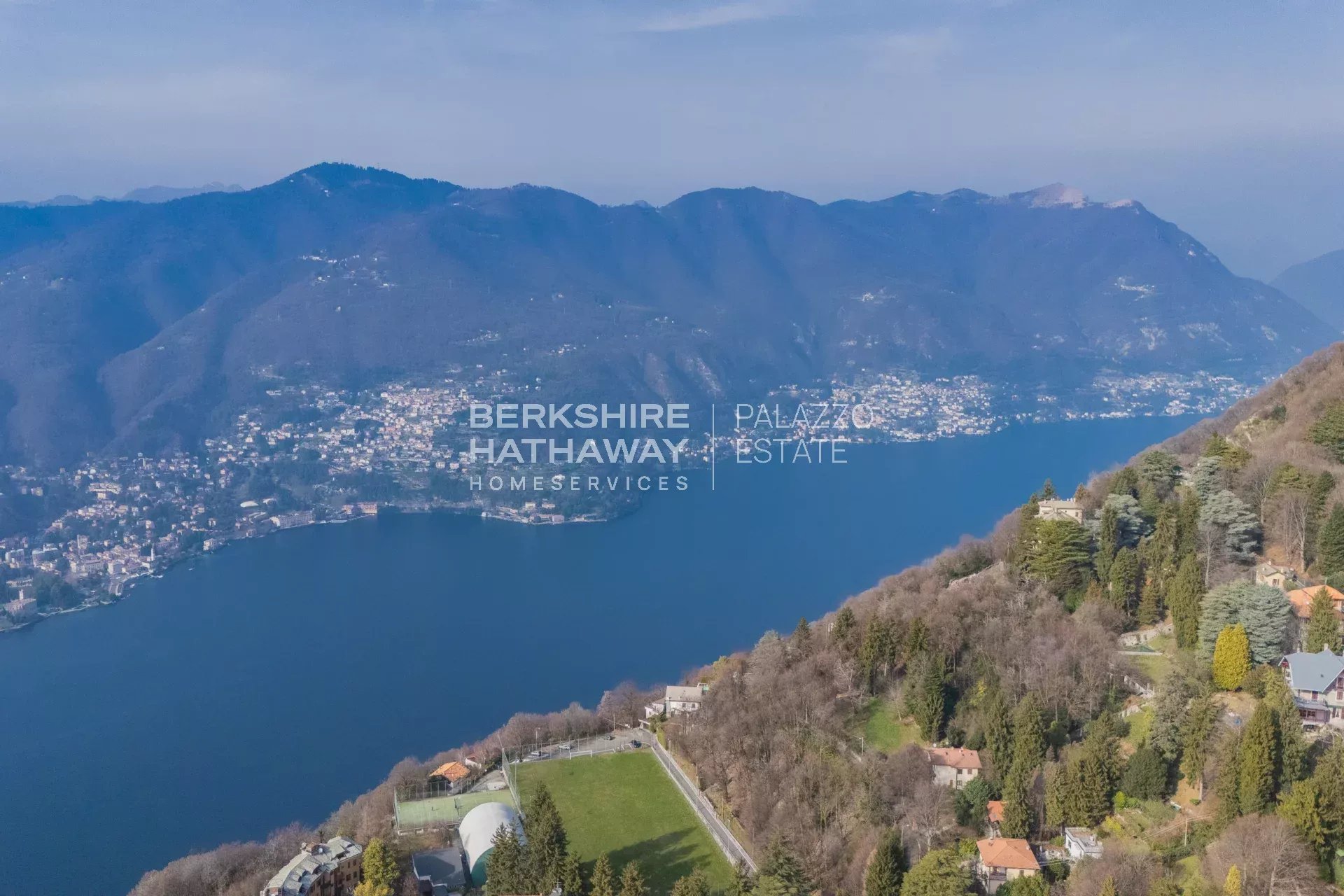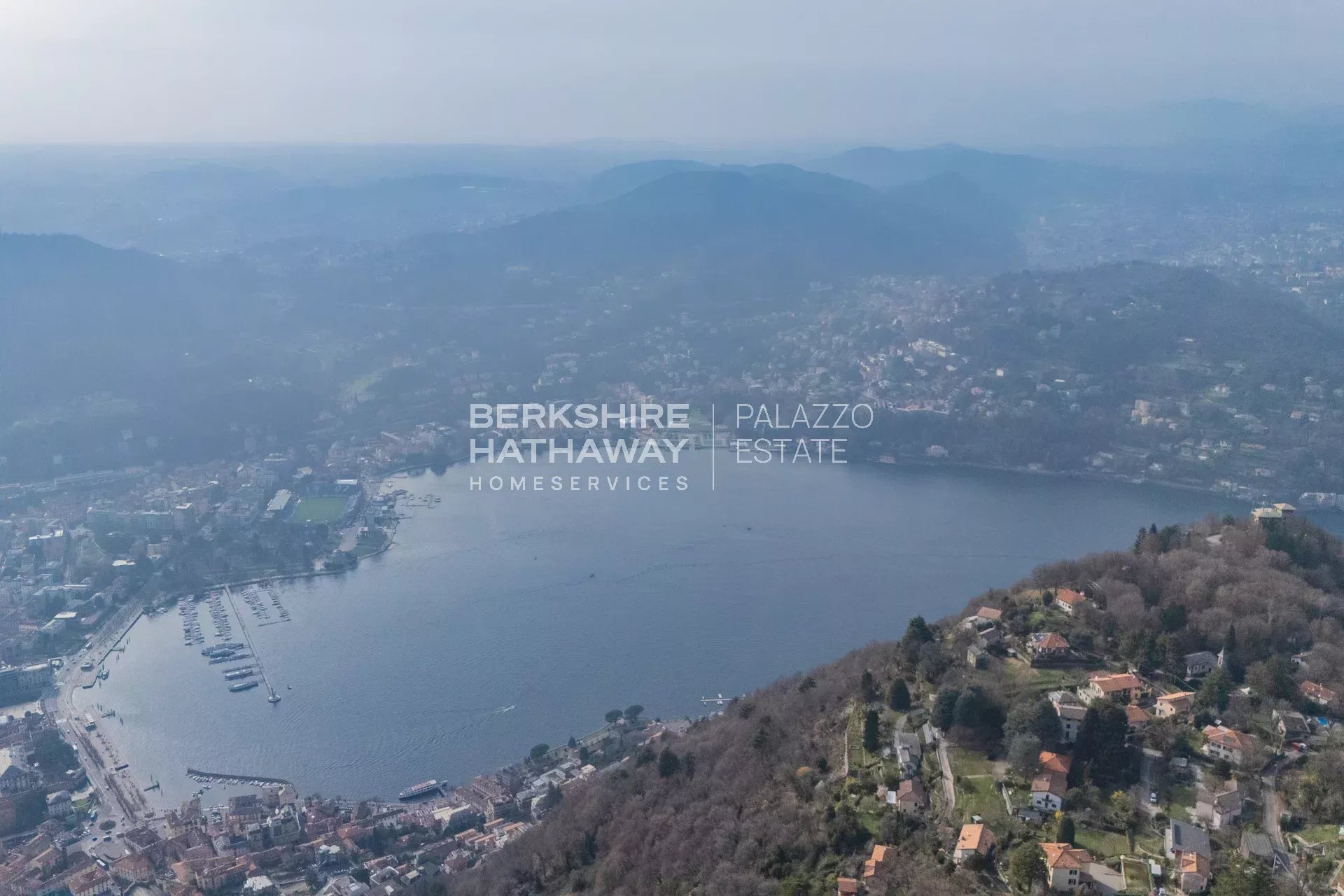 La proprietà è inserita in un giardino pianeggiante di circa 1.000 mq, arricchito da alberi ad alto fusto, aiuole fiorite e spazi dedicati alla quiete. Un gazebo e terrazze panoramiche accompagnano lo sguardo verso il lago di Como, il centro della città e l’arco alpino, dove nelle giornate limpide emerge il profilo del Monte Rosa.