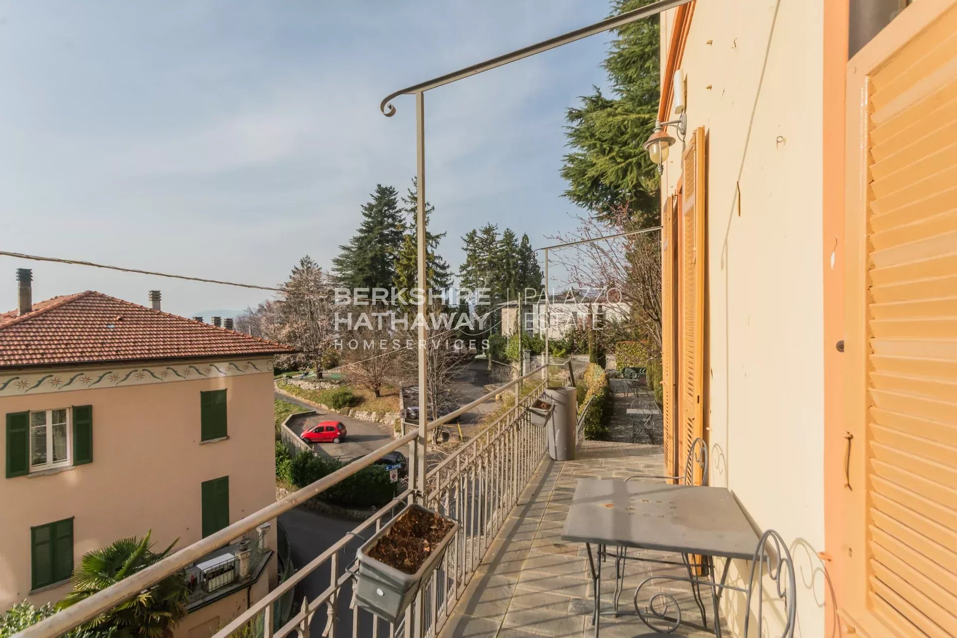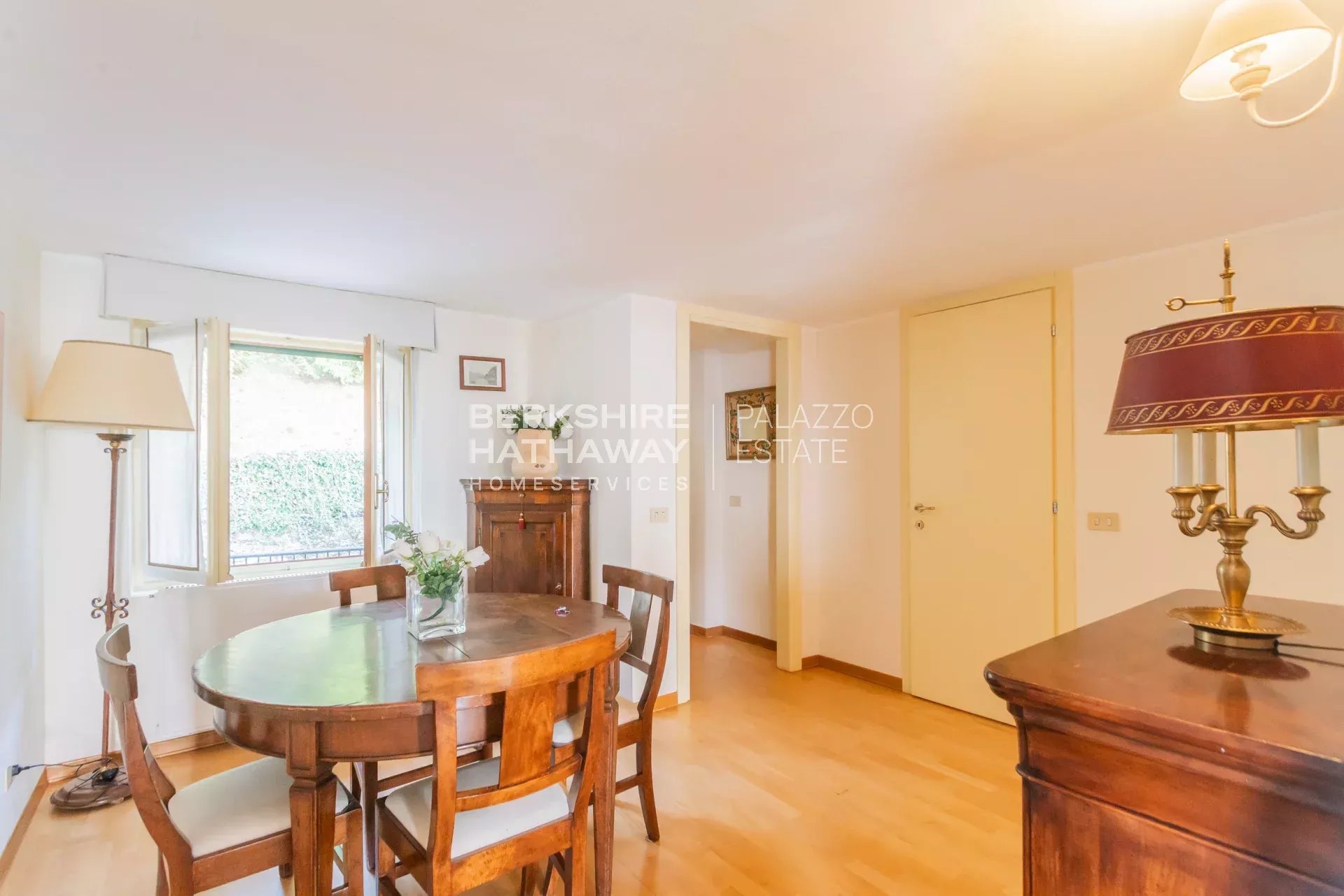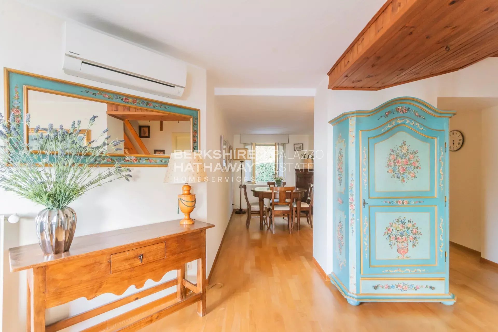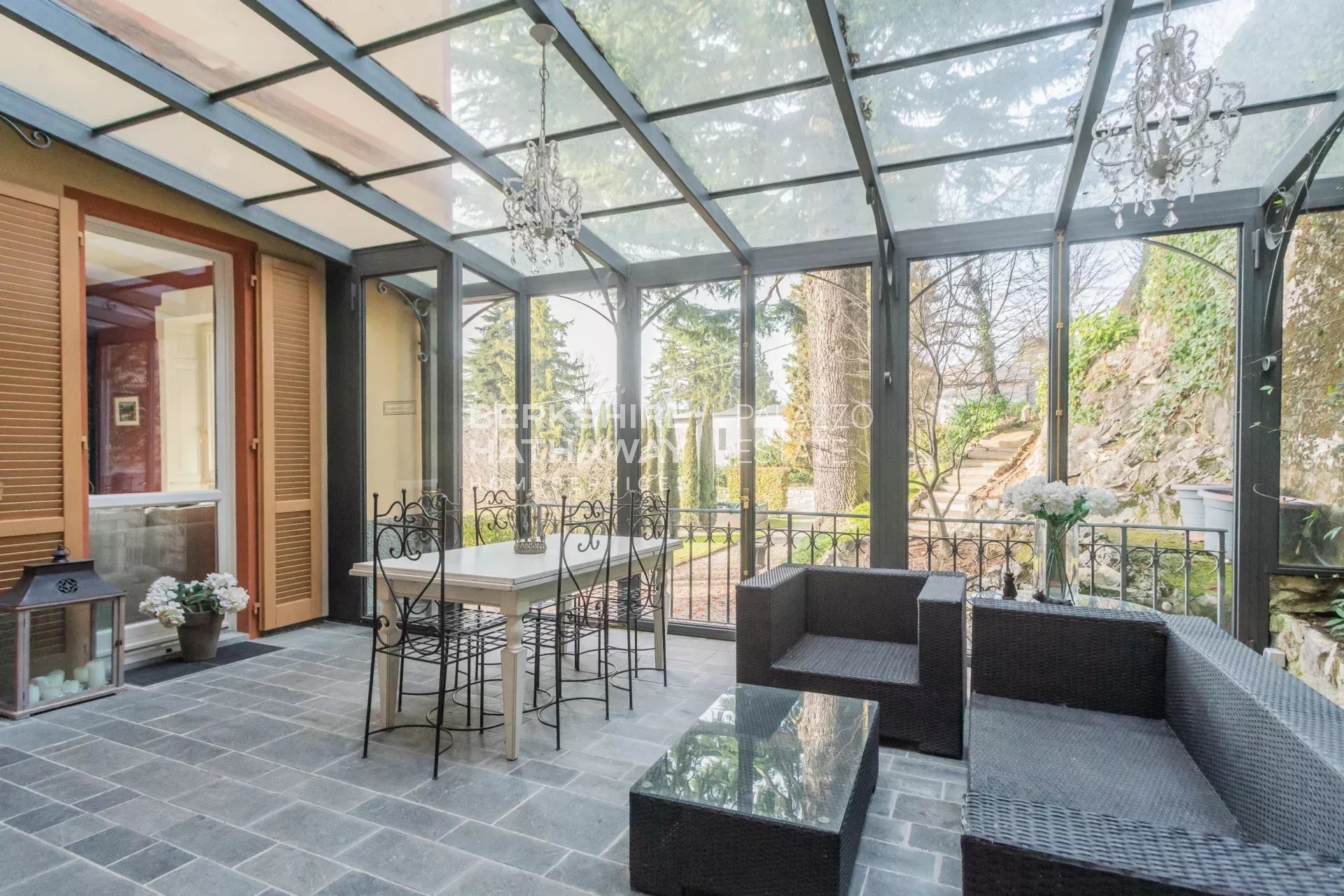 La proprietà è inserita in un giardino pianeggiante di circa 1.000 mq, arricchito da alberi ad alto fusto, aiuole fiorite e spazi dedicati alla quiete. Un gazebo e terrazze panoramiche accompagnano lo sguardo verso il lago di Como, il centro della città e l’arco alpino, dove nelle giornate limpide emerge il profilo del Monte Rosa.