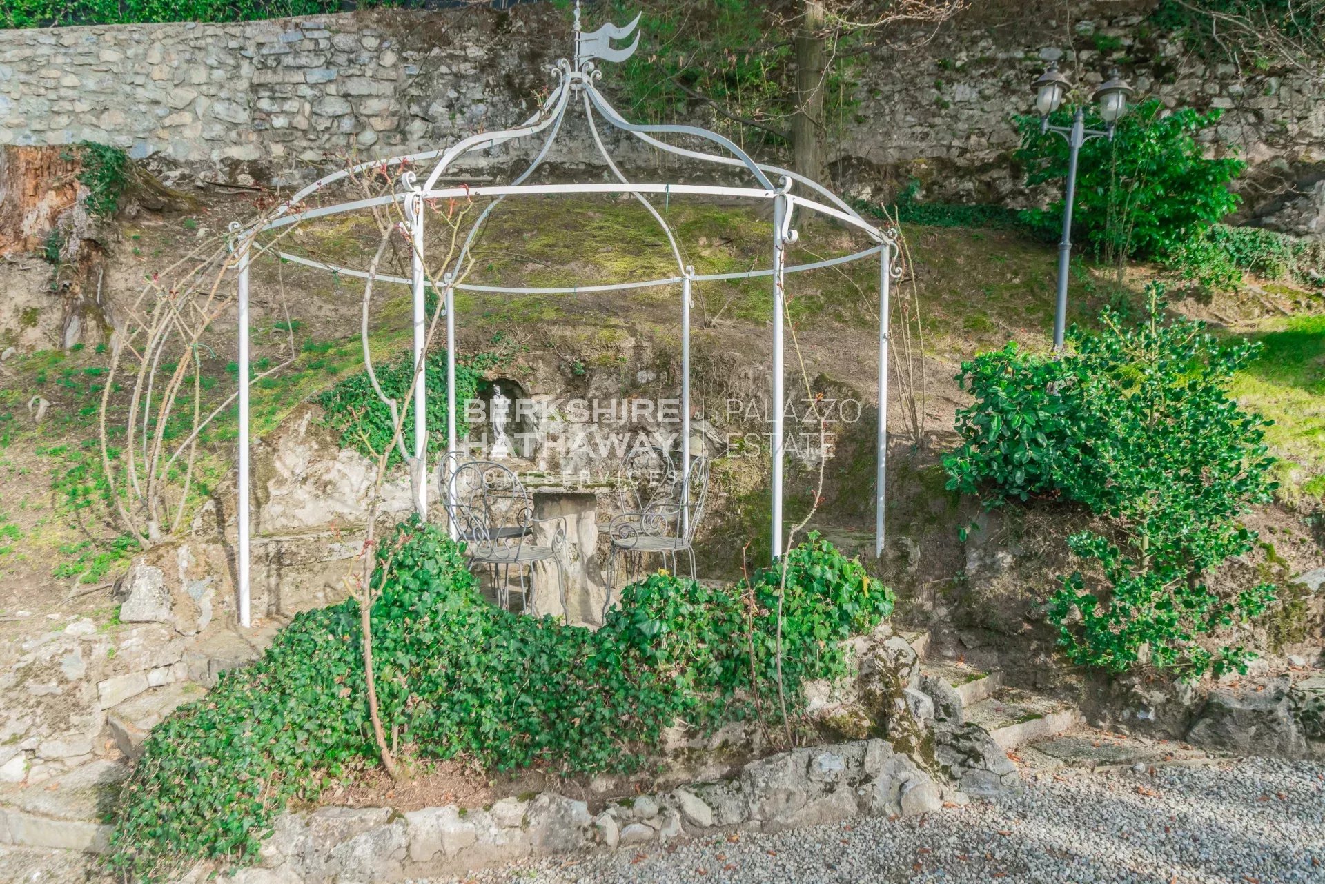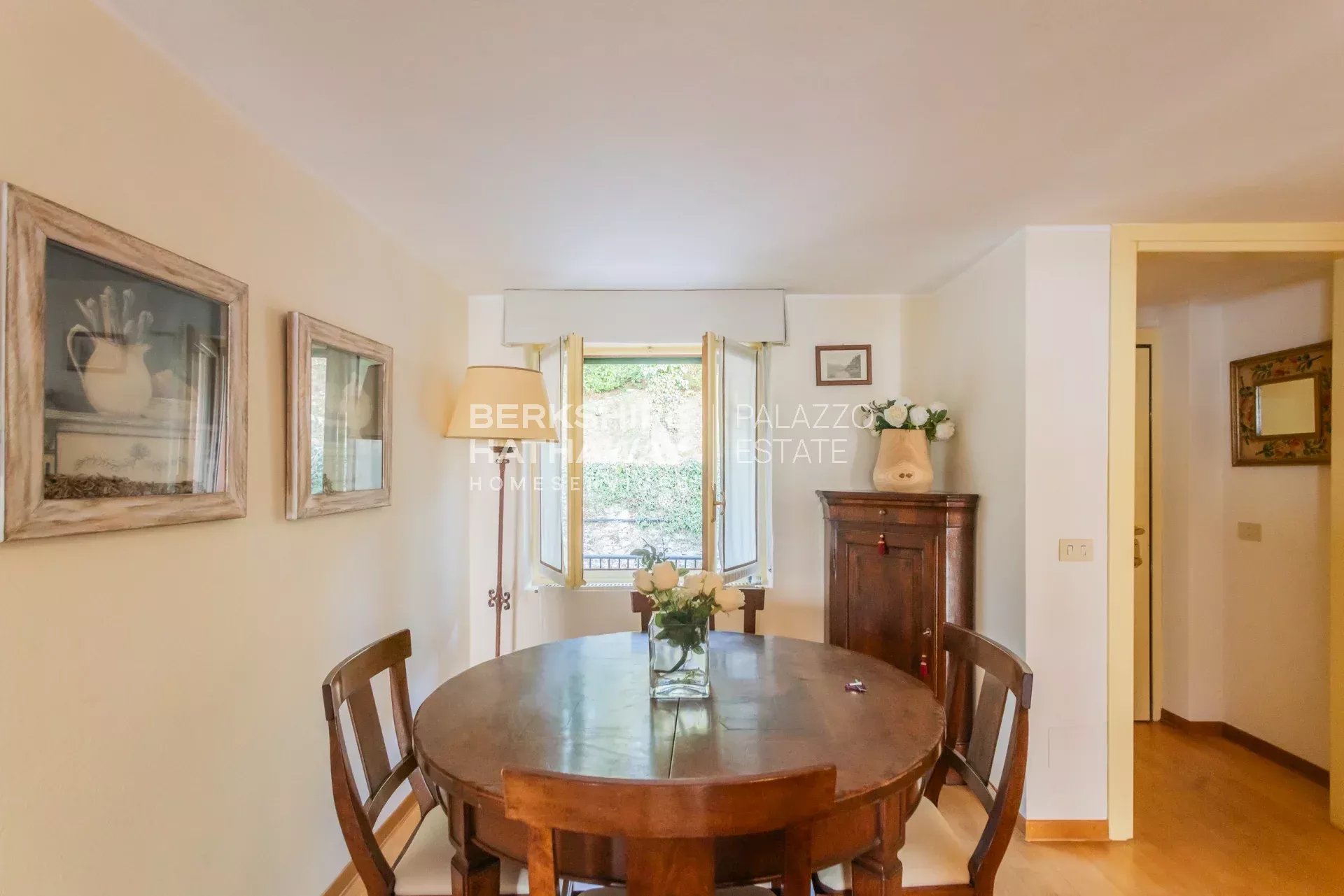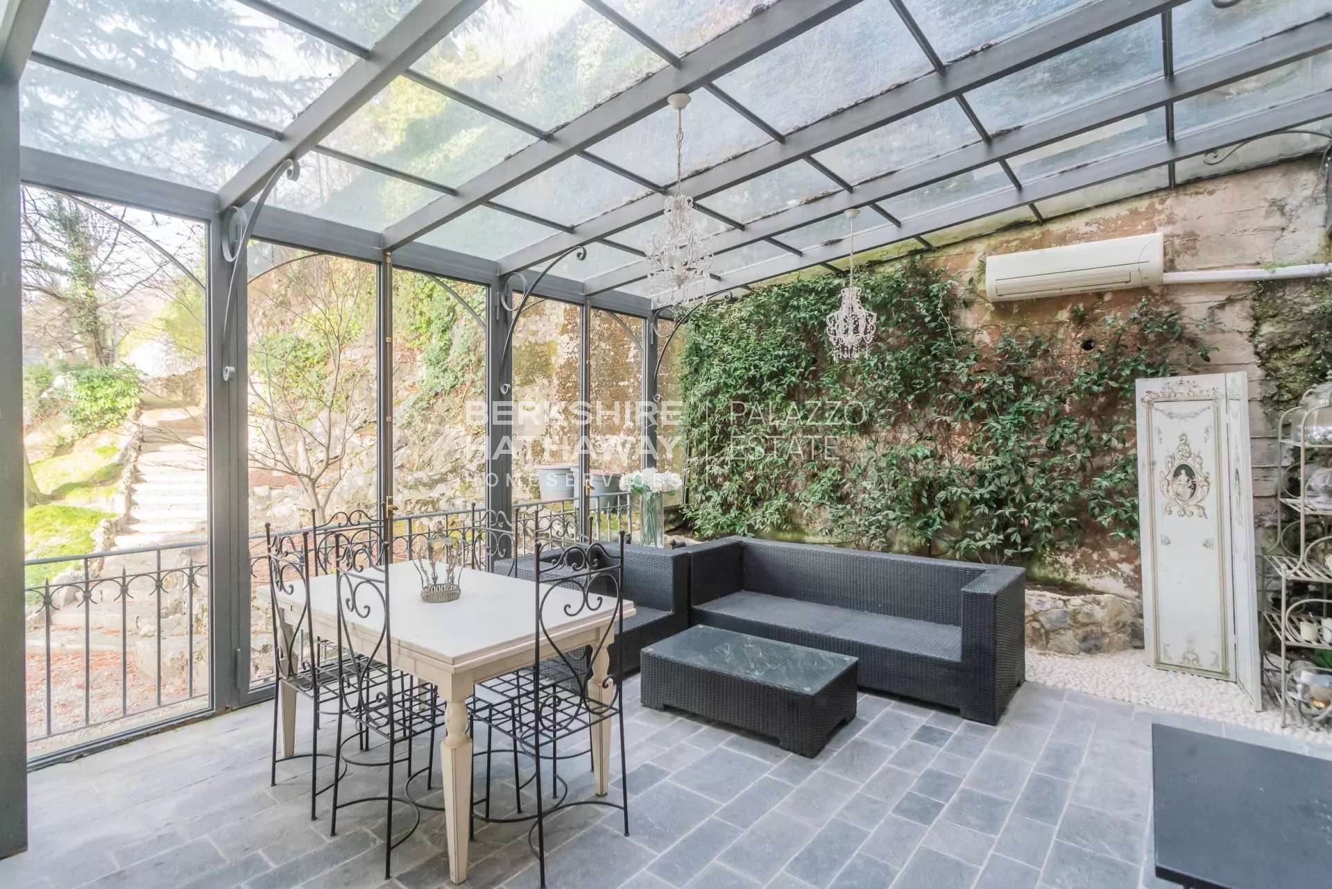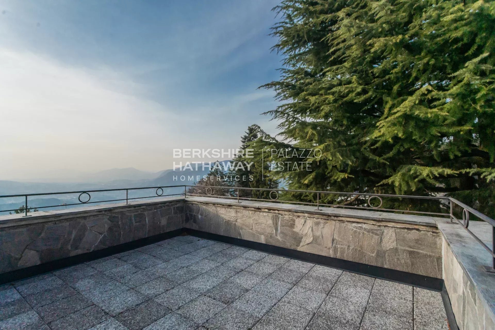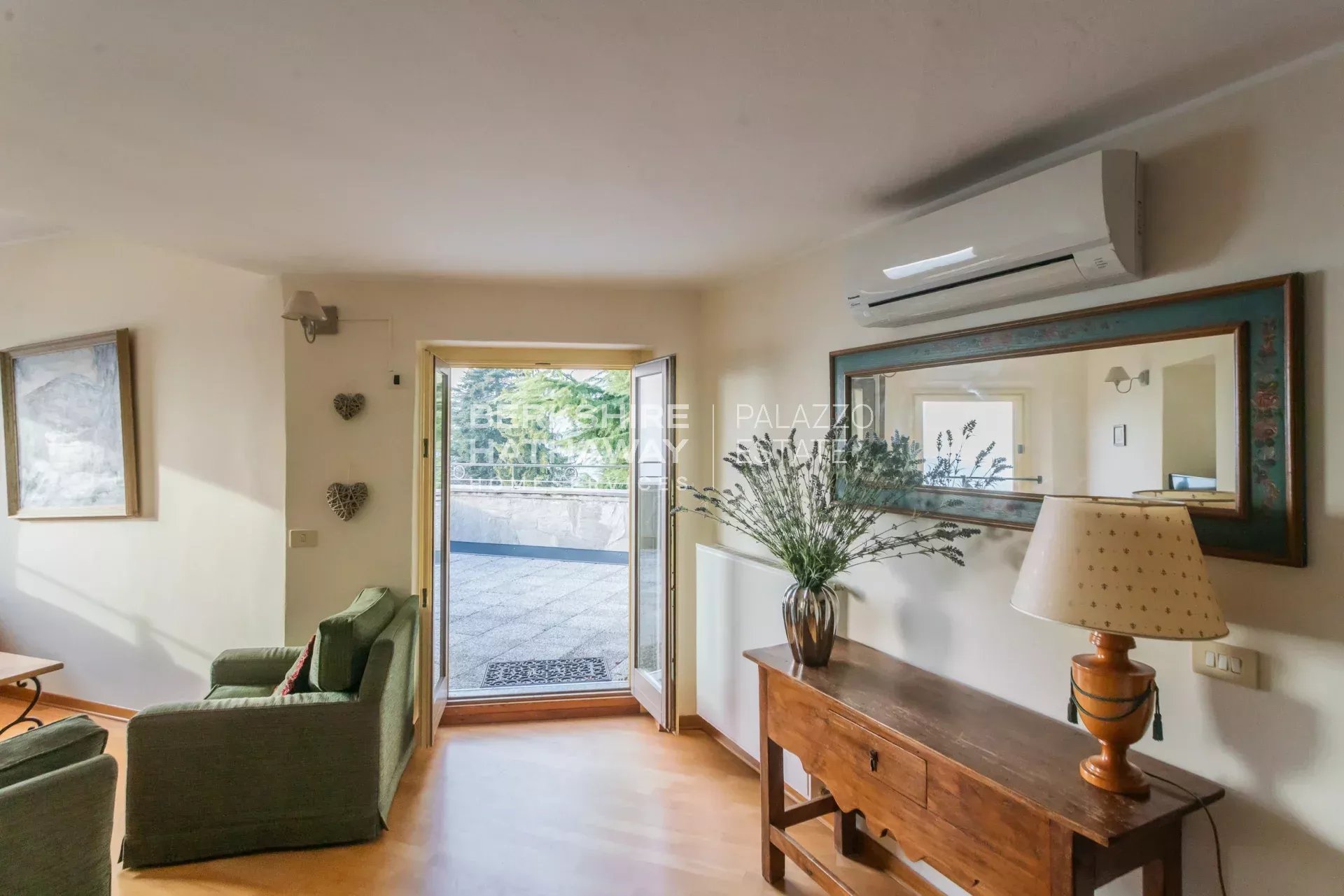La proprietà è inserita in un giardino pianeggiante di circa 1.000 mq, arricchito da alberi ad alto fusto, aiuole fiorite e spazi dedicati alla quiete. Un gazebo e terrazze panoramiche accompagnano lo sguardo verso il lago di Como, il centro della città e l’arco alpino, dove nelle giornate limpide emerge il profilo del Monte Rosa.