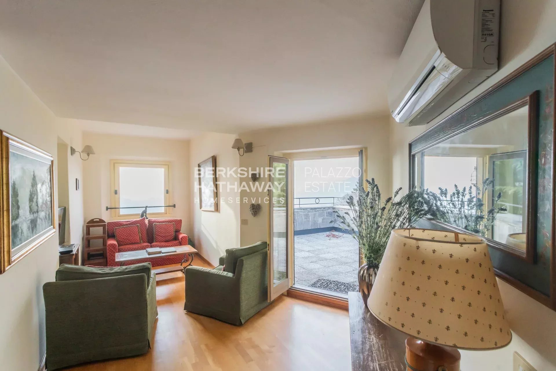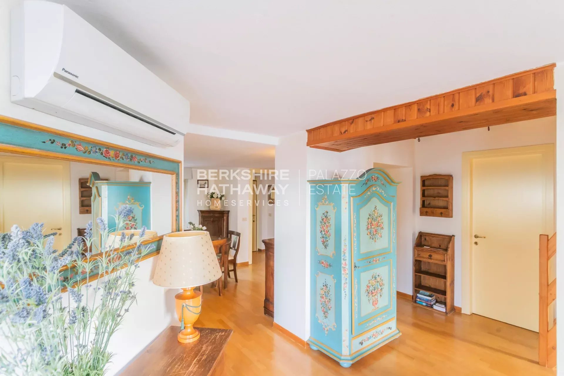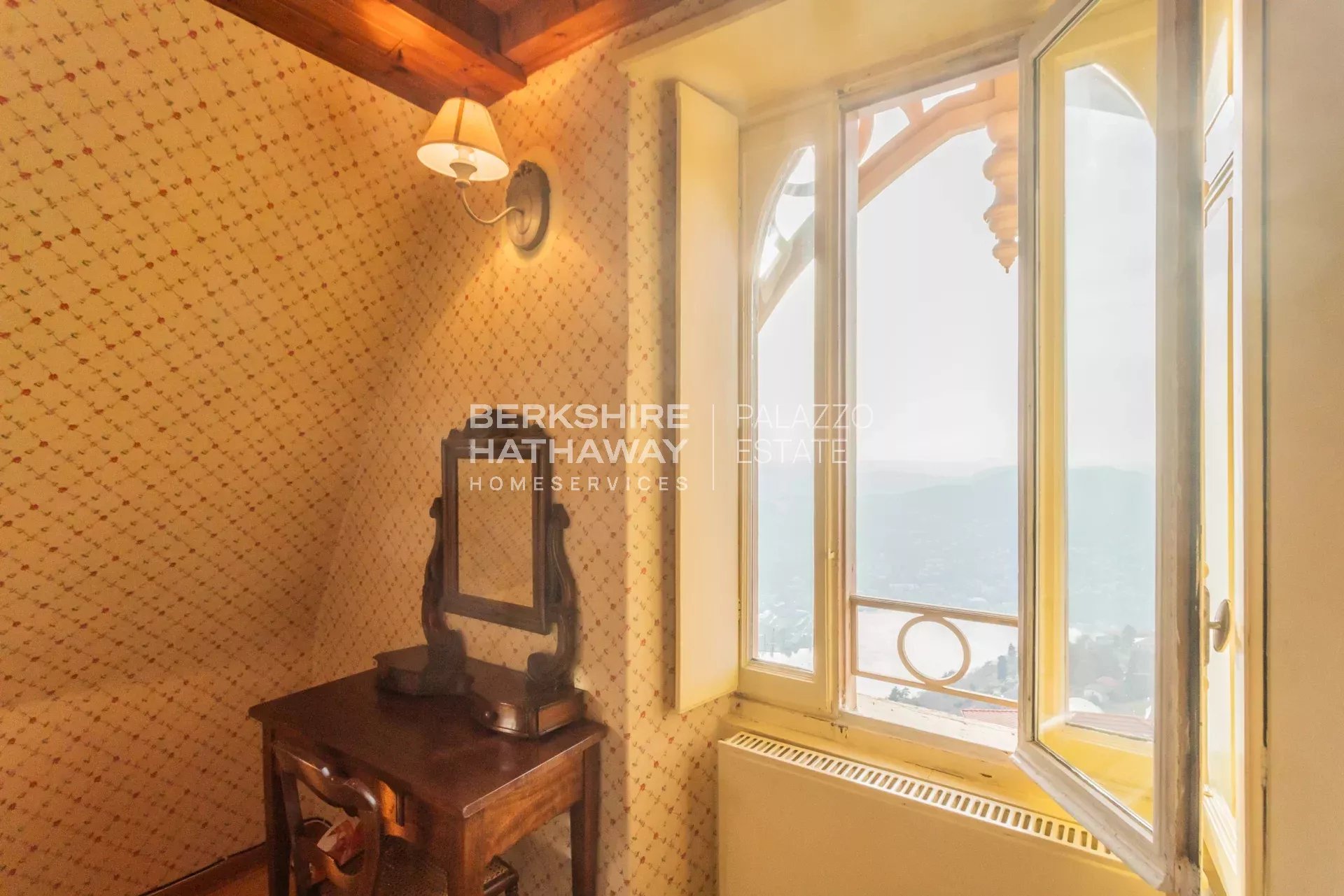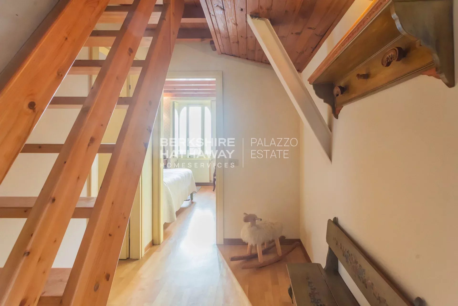 All’ultimo livello, all’interno della caratteristica torretta, è stato realizzato un appartamento indipendente composto da soggiorno, cucinino, una camera da letto e un bagno. Da questo livello si accede a una terrazza privata che offre una prospettiva ampia sul lago di Como e sul paesaggio alpino. La proprietà dispone inoltre di quattro posti auto.