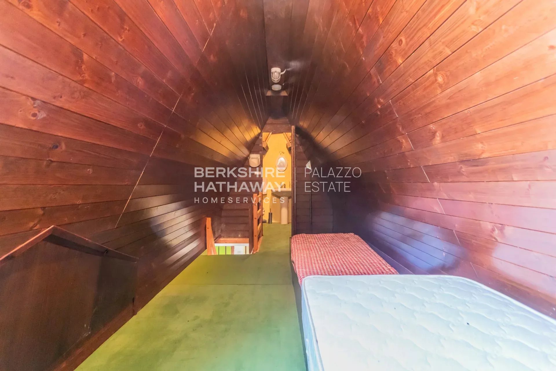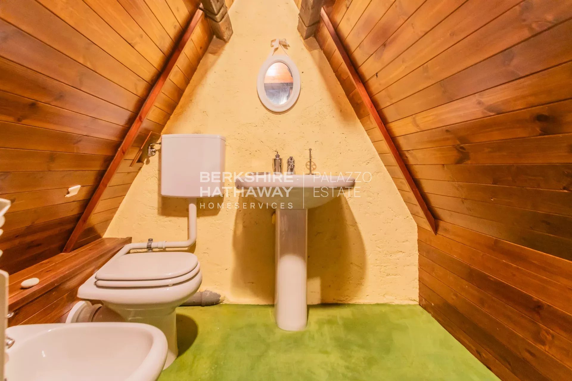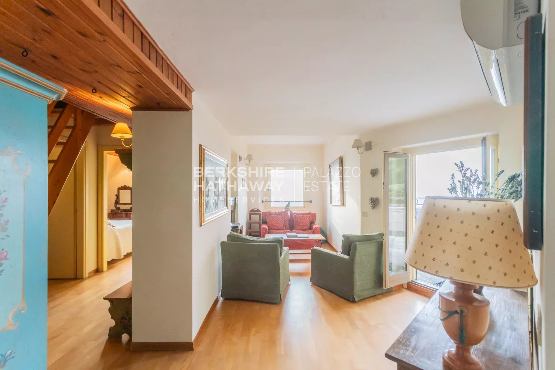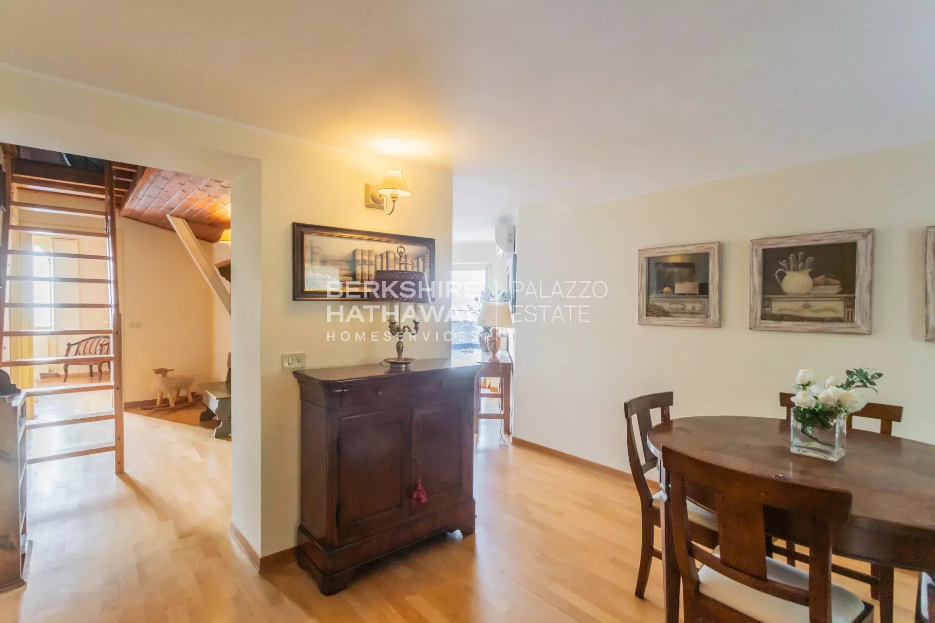 All’ultimo livello, all’interno della caratteristica torretta, è stato realizzato un appartamento indipendente composto da soggiorno, cucinino, una camera da letto e un bagno. Da questo livello si accede a una terrazza privata che offre una prospettiva ampia sul lago di Como e sul paesaggio alpino. La proprietà dispone inoltre di quattro posti auto.